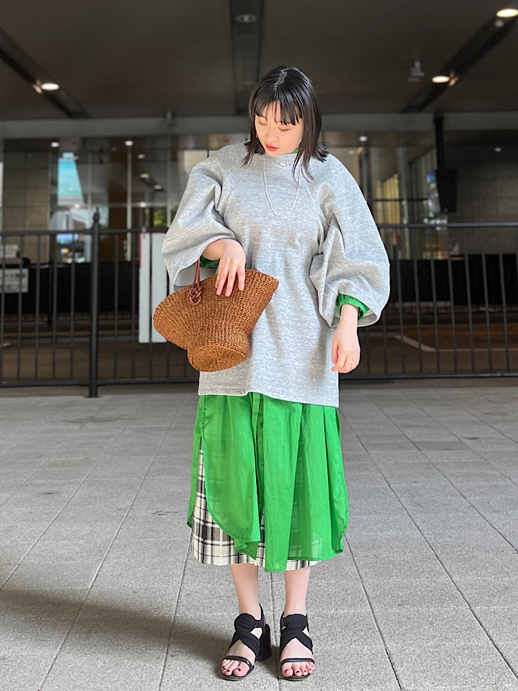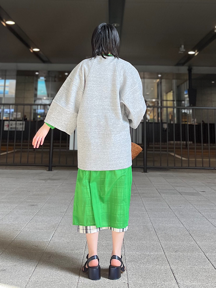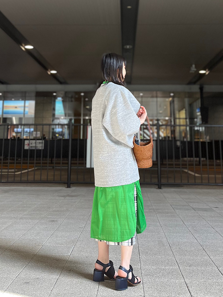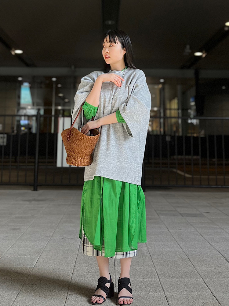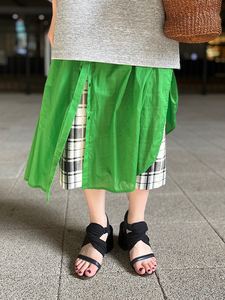 ぱきっとした発色のグリーンのワンピースをモノトーンのスカートとトップスでよりデイリー使いに落とし込んでみました。春のおでかけにおすすめのスタイリングです!