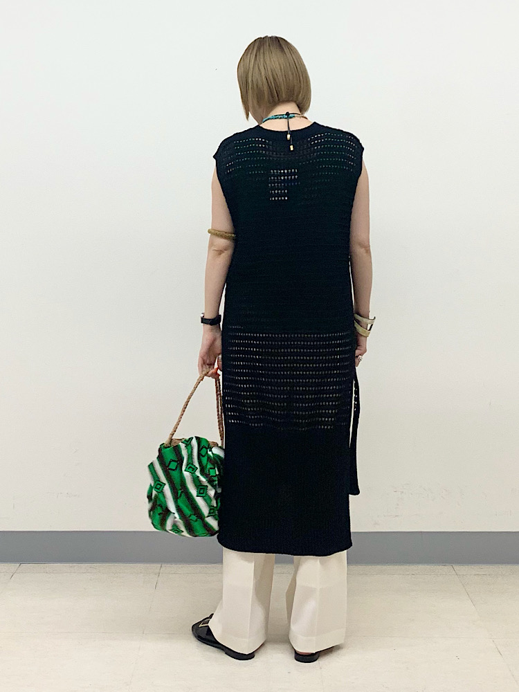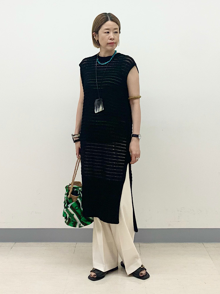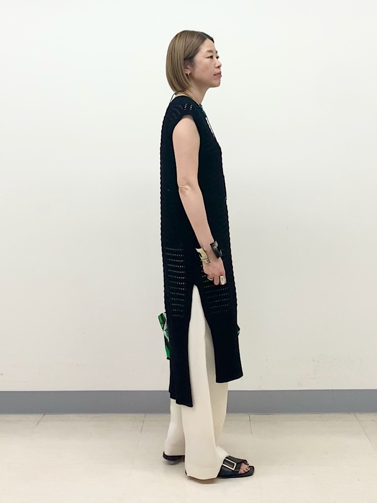 着心地:サイドにスリットがあり、重ね着しても負担なく着られます。シャリ感のあるニットなので、サラッとしていて気温の高い季節でも着やすいです。