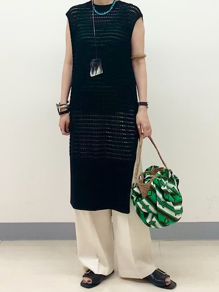 メッシュのインナーにさりげなくトレンドカラーのグリーンを透けさせて、モノトーンコーデを軽い印象に。