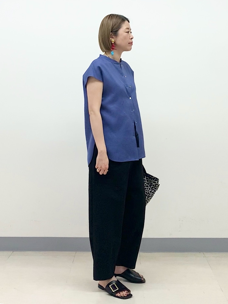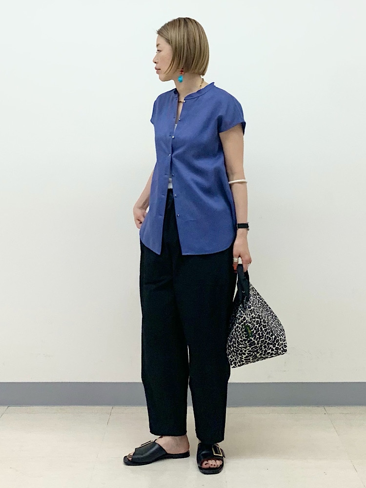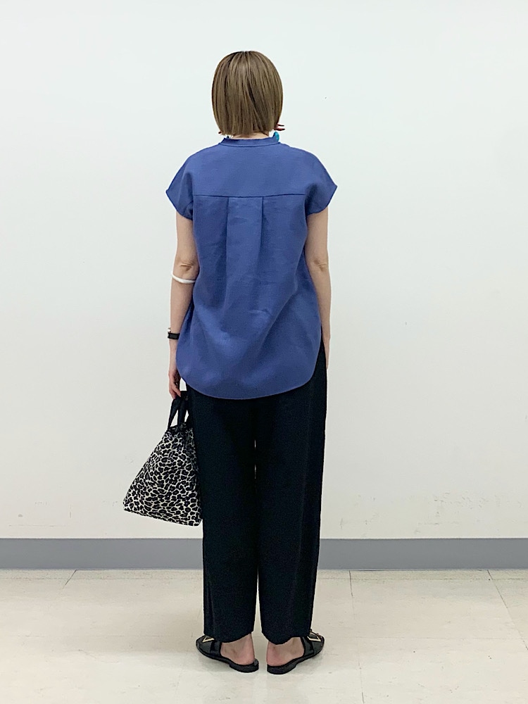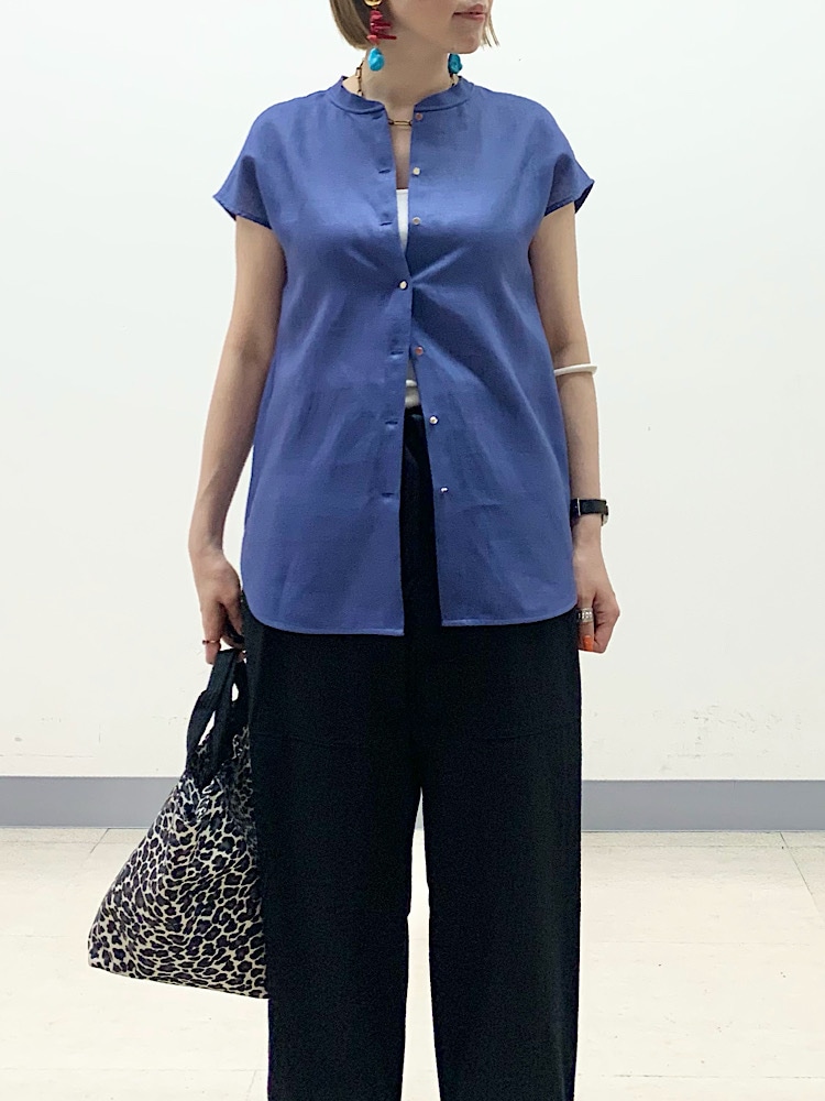 シンプルなリネンシャツは、真ん中のボタンをひとつだけ留めて、Vラインを作り、シルエットに変化をつけました。ボリュームのあるボトムスと合わせても、インにしなくてもすっきり見えます。