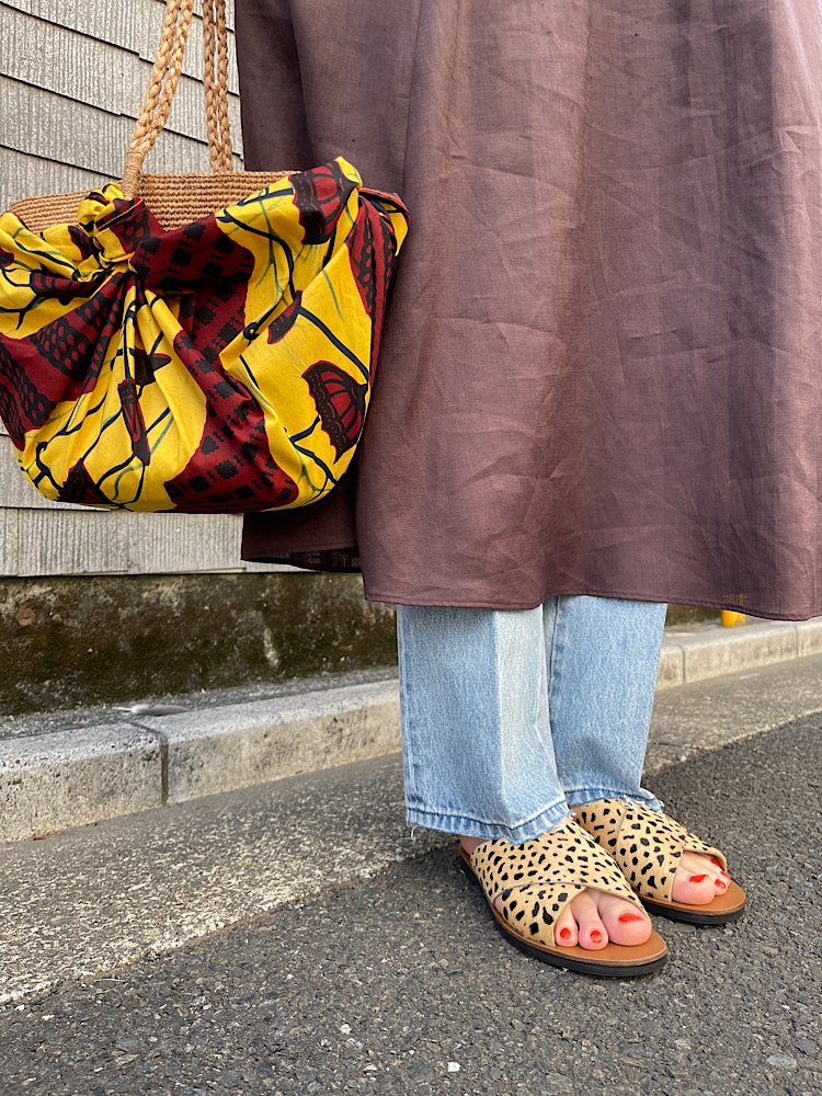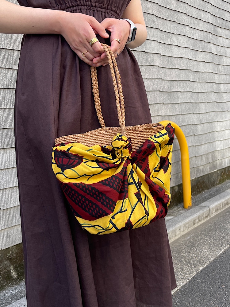 素材感/着心地:これからのシーズンに1つは持っておきたいカゴバック。バンダナが巻かれている様なデザインでカジュアルにもクラシックなファションにも合わせやすいです。
