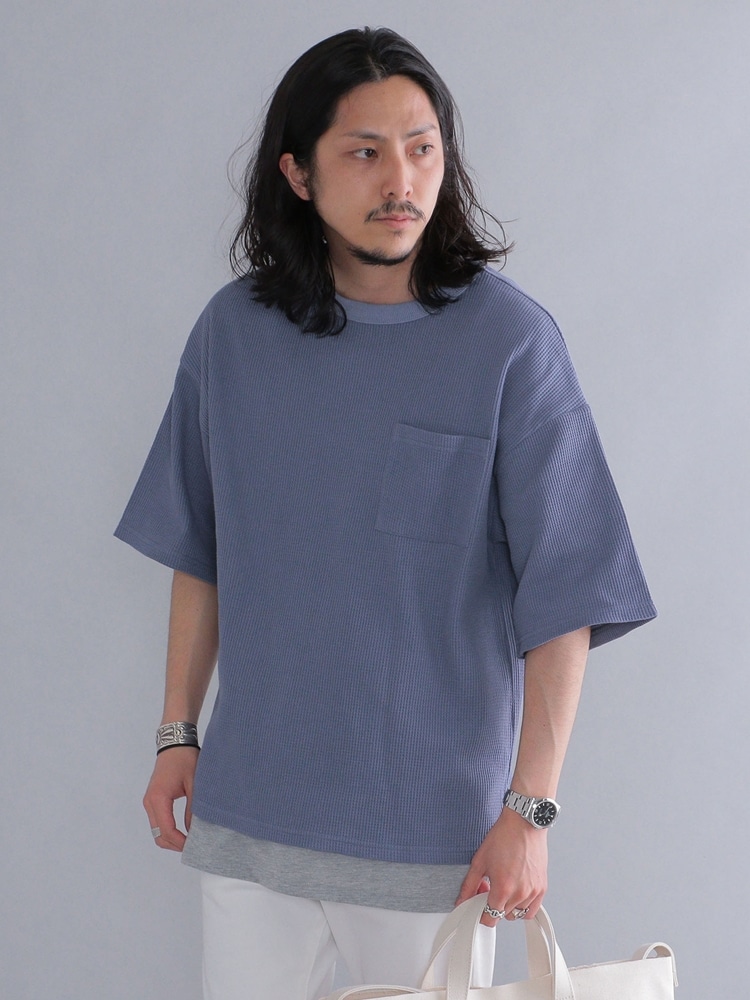 素材感:Tシャツは柔らかな肌触りで伸縮性があり着心地の良いワッフル素材を使用。