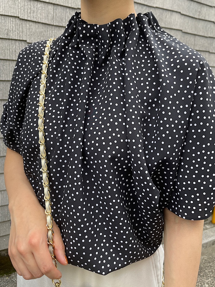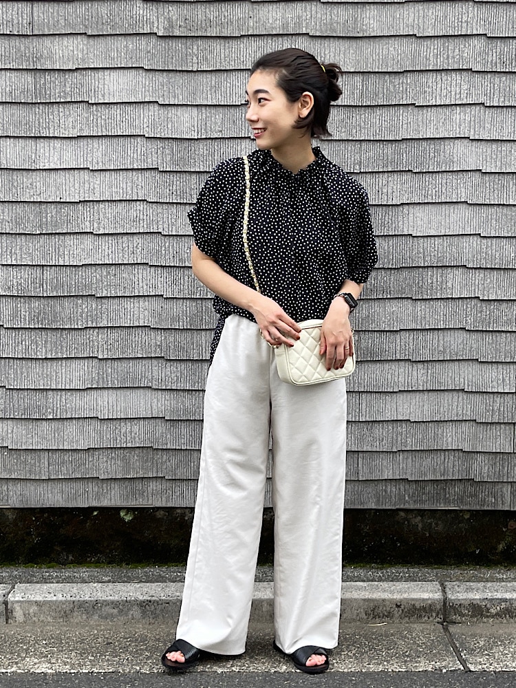 オンオフ問わず使えるドットブラウスでリラックスきれいめコーディネート。