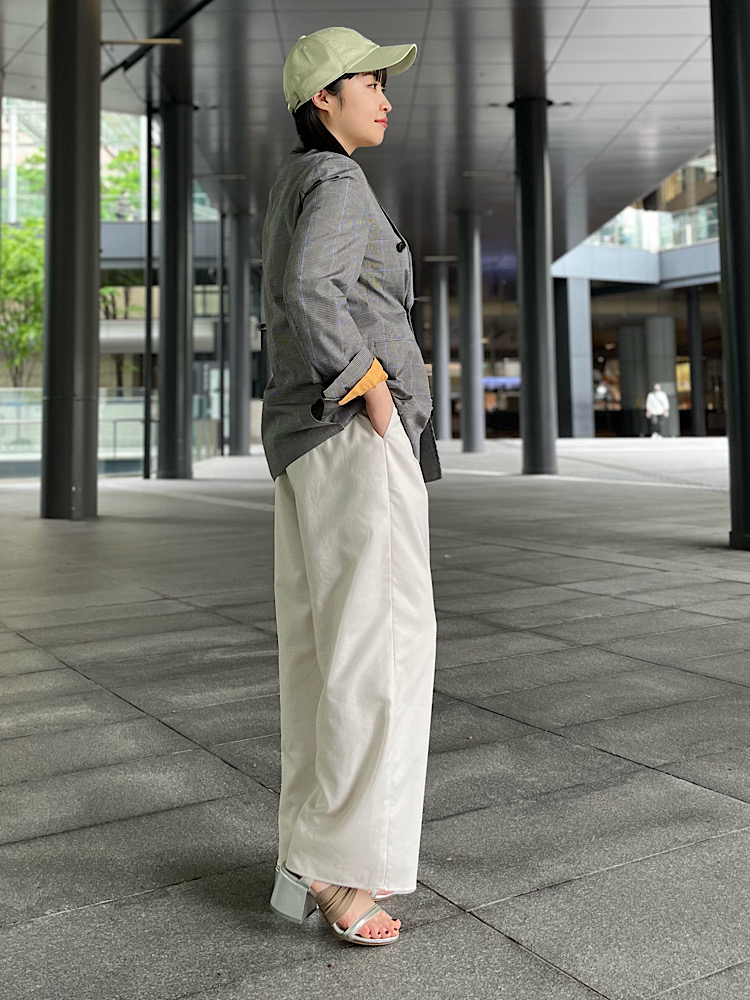 着心地:リラックス感のあるシルエットで履きたかったので、普段のサイズよりも1つ大きいものを着用しています。ウエストがドロスト仕様になっているので、トップスに合わせて調節して頂けます。つるっとさらっとした生地が肌当たりも良く、とても動きやすいです。これから汗ばむ季節でも快適に着用頂けそうです!