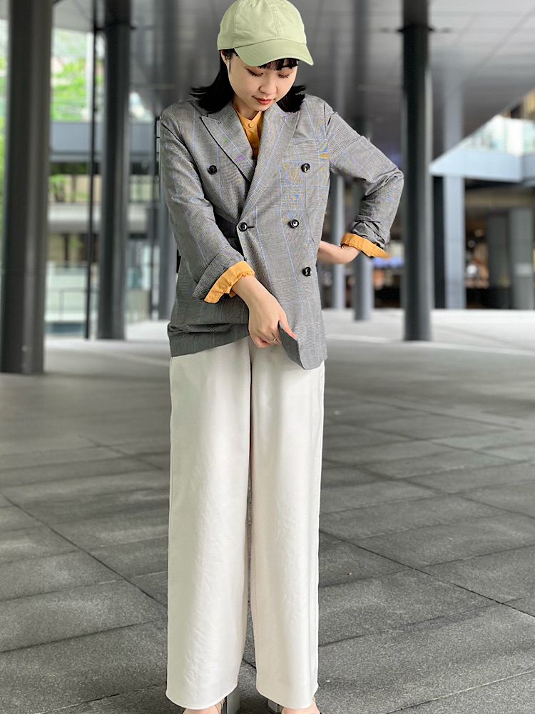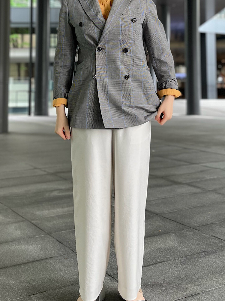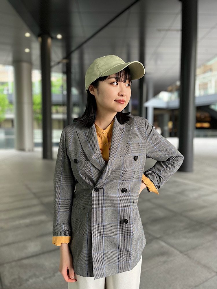着心地:薄くて柔らかいシャツのような生地でかたい印象になりすぎません。裏地がついていないので、長い期間ご愛用頂けます。肩も袖も全体的にゆったりとしたシルエットですが、ドロップショルダーではないので大きくカジュアルに見えないところもおすすめポイントです。冬っぽい印象になりがちなグレンチェックも麻素材で取り入れると今の季節から使いやすいです!
