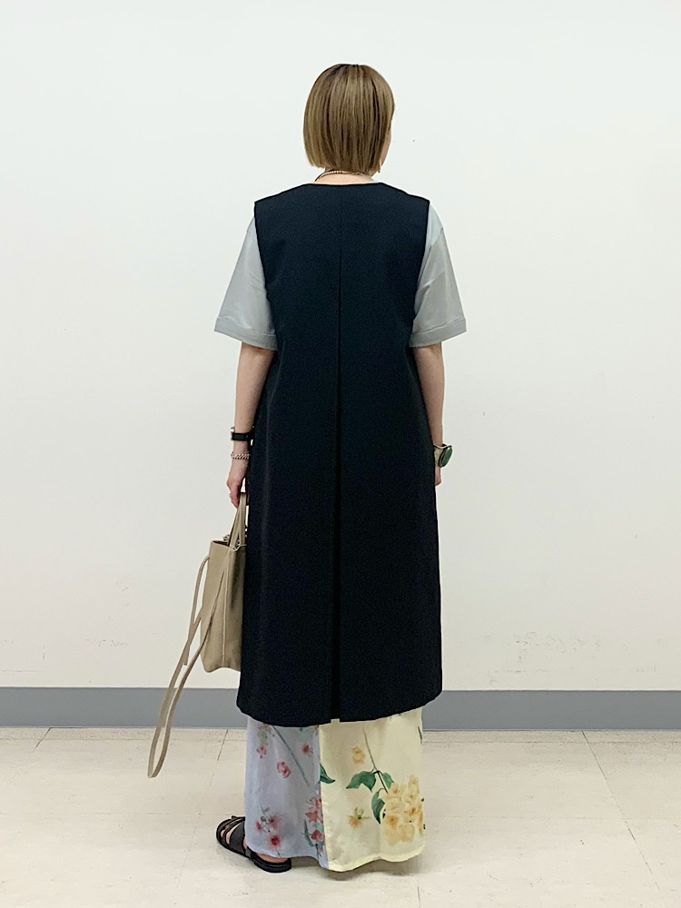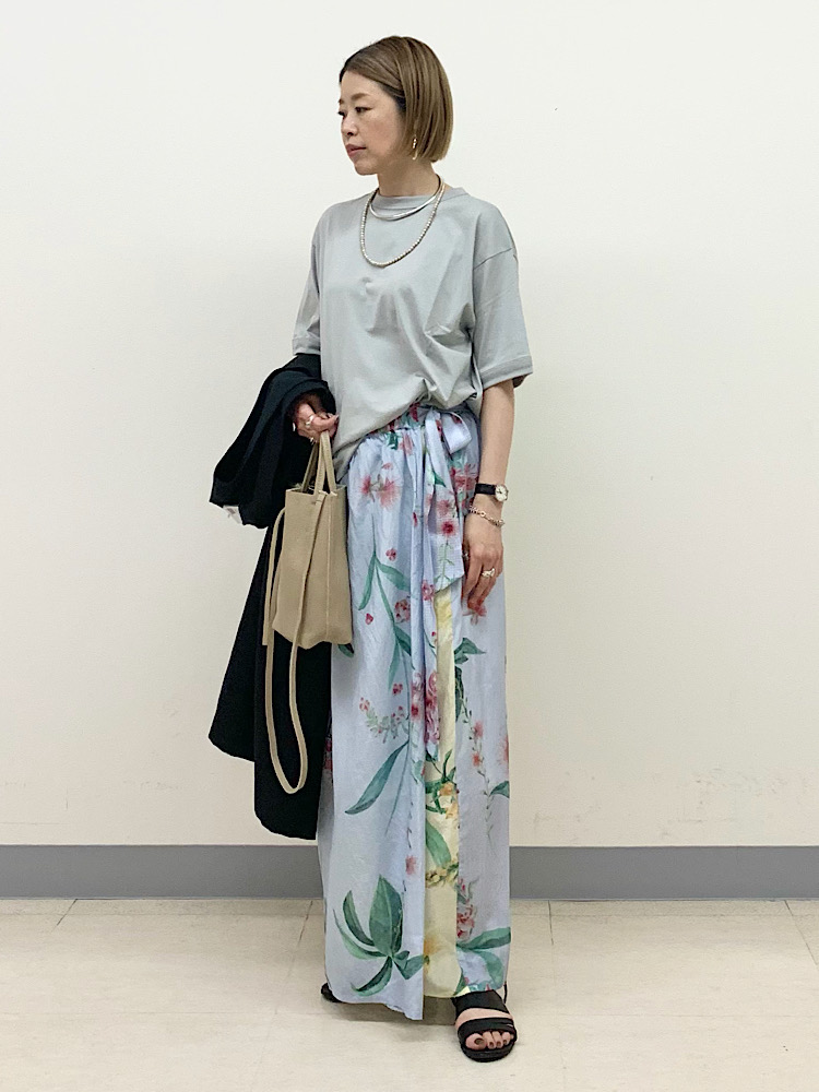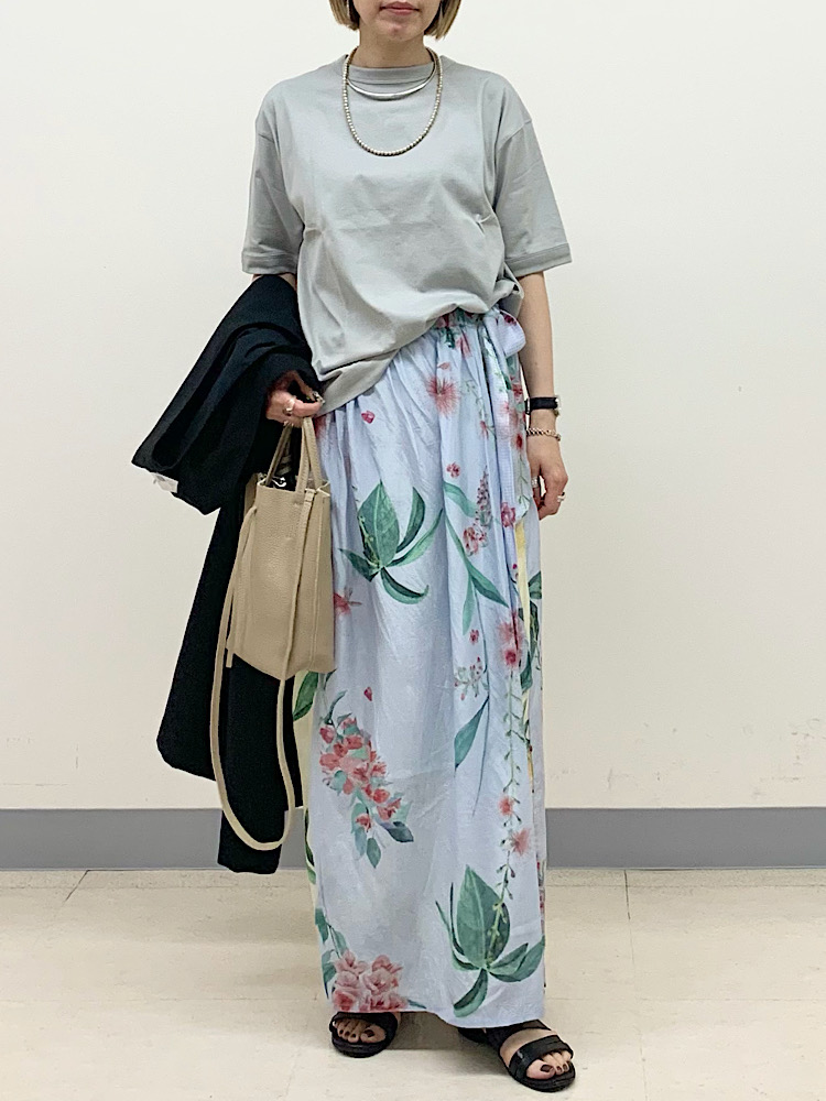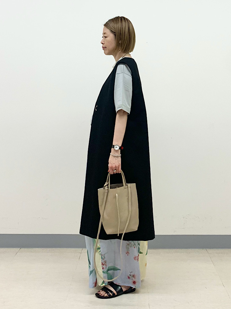 フェミニンな花柄スカートを、黒のジレでシャープな着こなしに。黒が浮かないように、サンダルでも黒を合わせています。