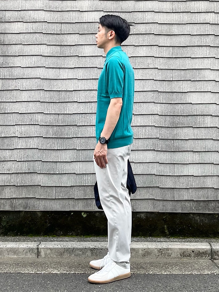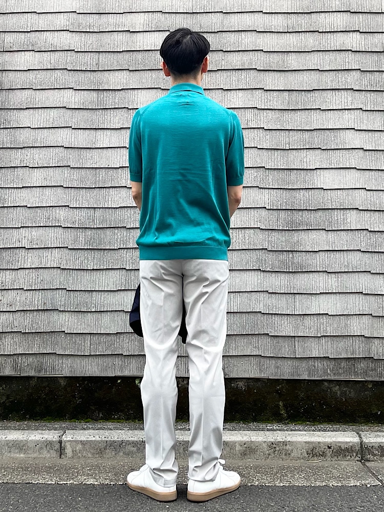 発色の良いニットポロシャツをメインにコーディネート。