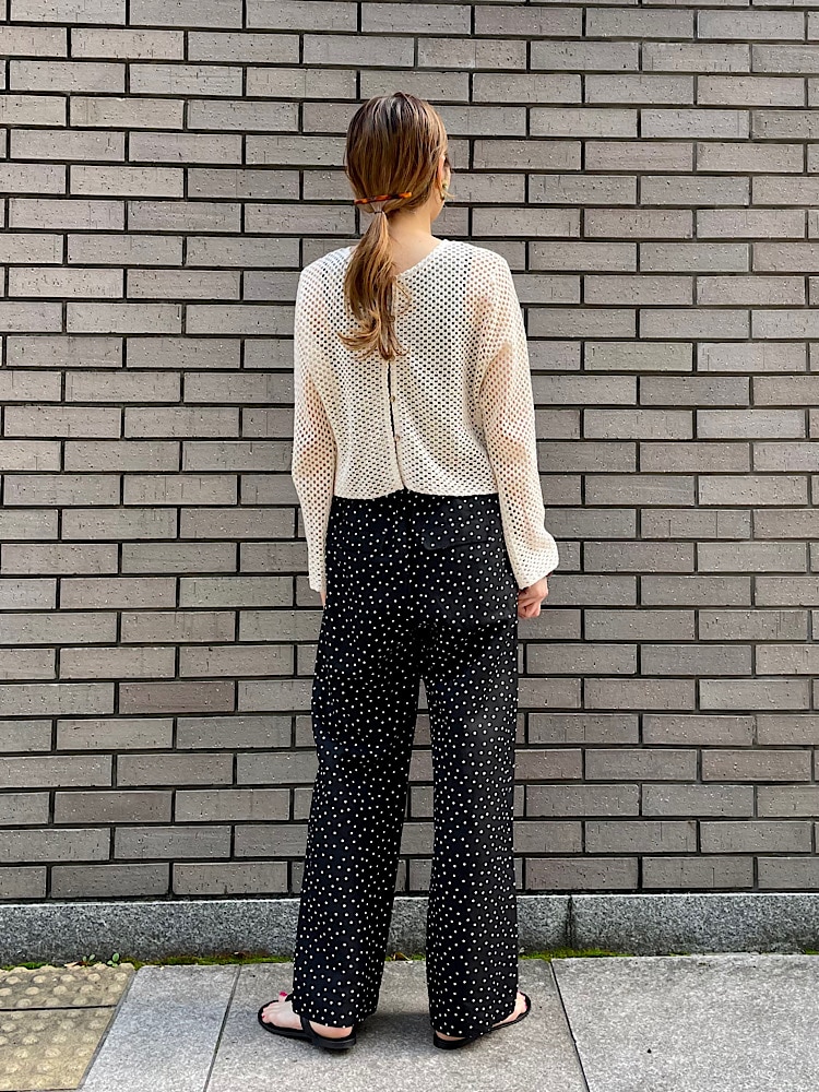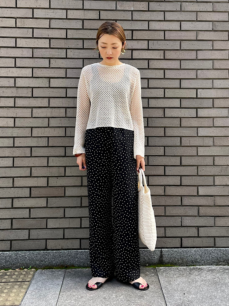 素材感・着心地:麻/レーヨンの少しハリのある素材感。薄手で肌離れが良いです。太さのあるストレートのシルエットです