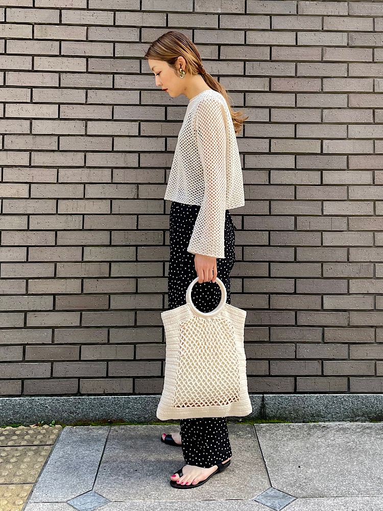 素材感・着心地:コットンの柔らかい素材。メッシュ編みになっており透け感があります。前後で着用して頂ける2WAYの仕様です