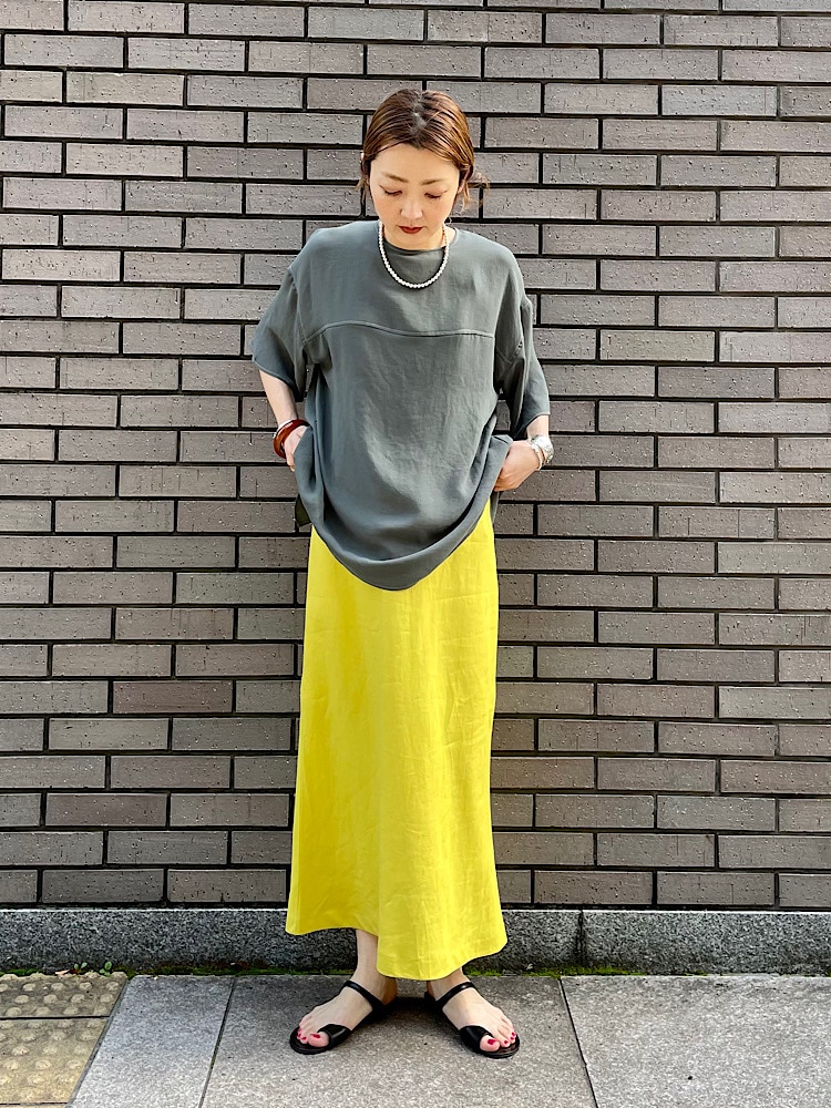 素材感・着心地:麻/レーヨンの少しハリのある素材感。裏地が付いており透け感はありません。裾にかけて広がりのあるシルエットです