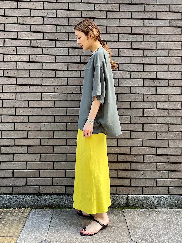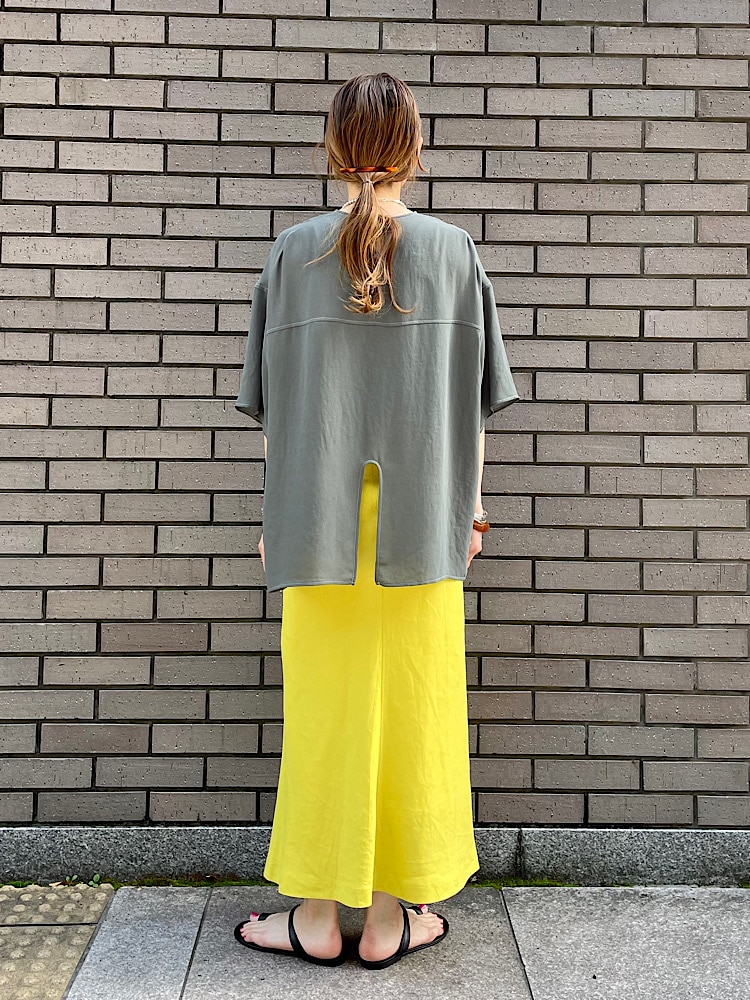 素材感・着心地:ポリエステルのさらりとした素材。ボリューム感がありますが、落ち感と後ろに入ったスリットで軽い印象で着用できます