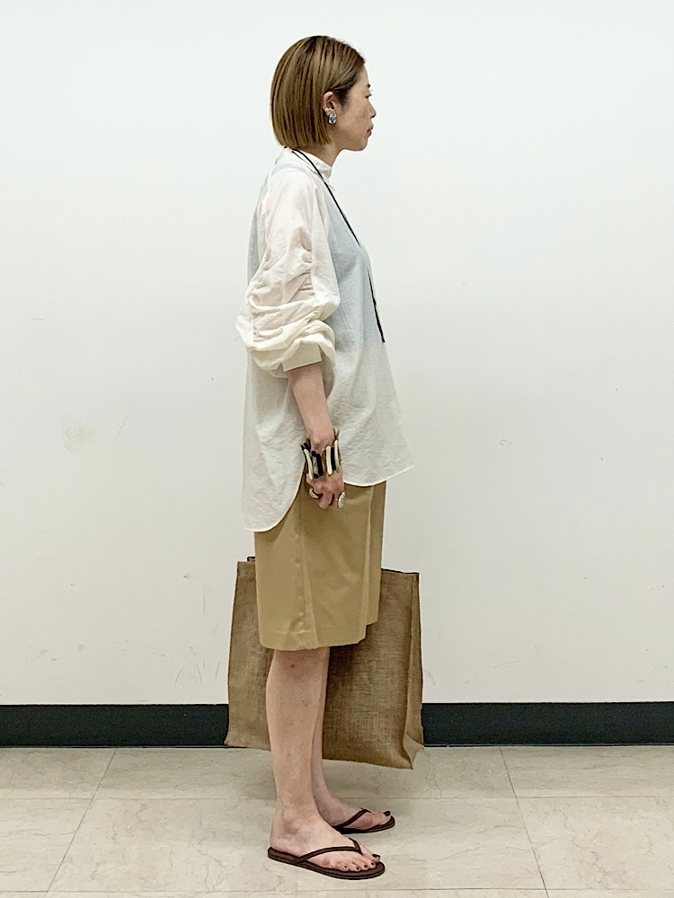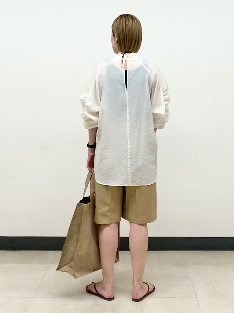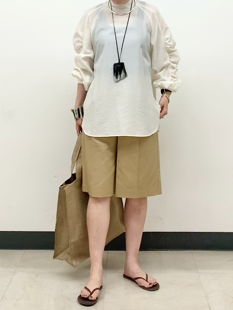 淡いベージュ系でまとめたワントーンコーデ。ハーフパンツと大きいバッグを合わせて、甘くなりすぎないようにしました。