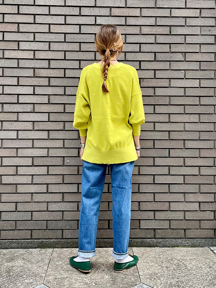 素材感・着心地:ポリエステル/コットンの柔らかい素材。薄手で軽く着用しやすいです。サイドに深めのスリットも入っておりボトムを選ばず着用できます