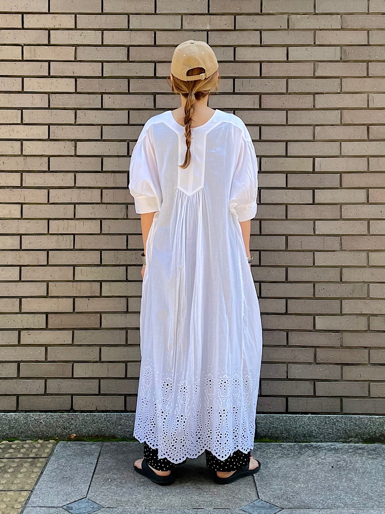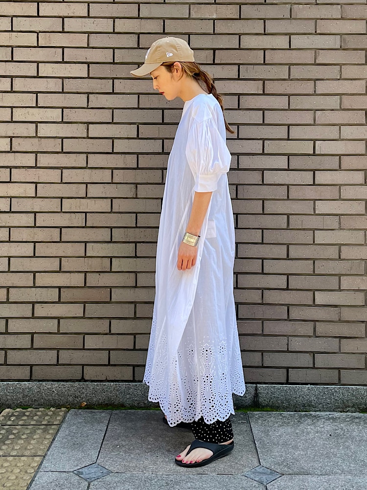 素材感・着心地:コットンの柔らかい素材。透け感がある為、ペチコートが付いています。裾のカットレース部分は可愛い印象ですが首元に開きがある為、程よく抜け感がでます