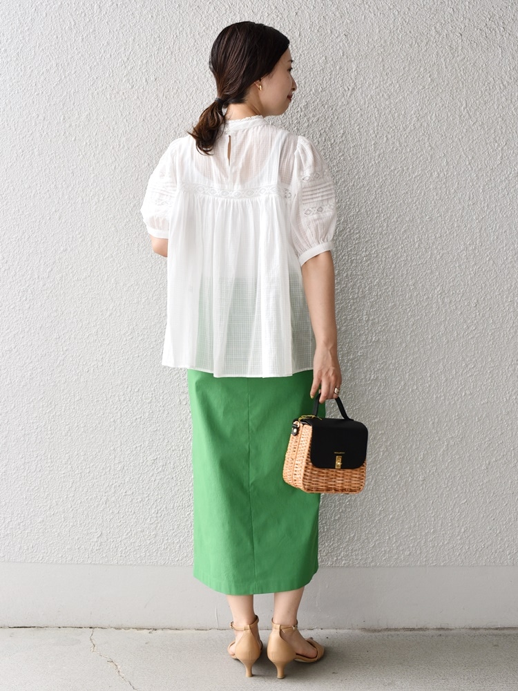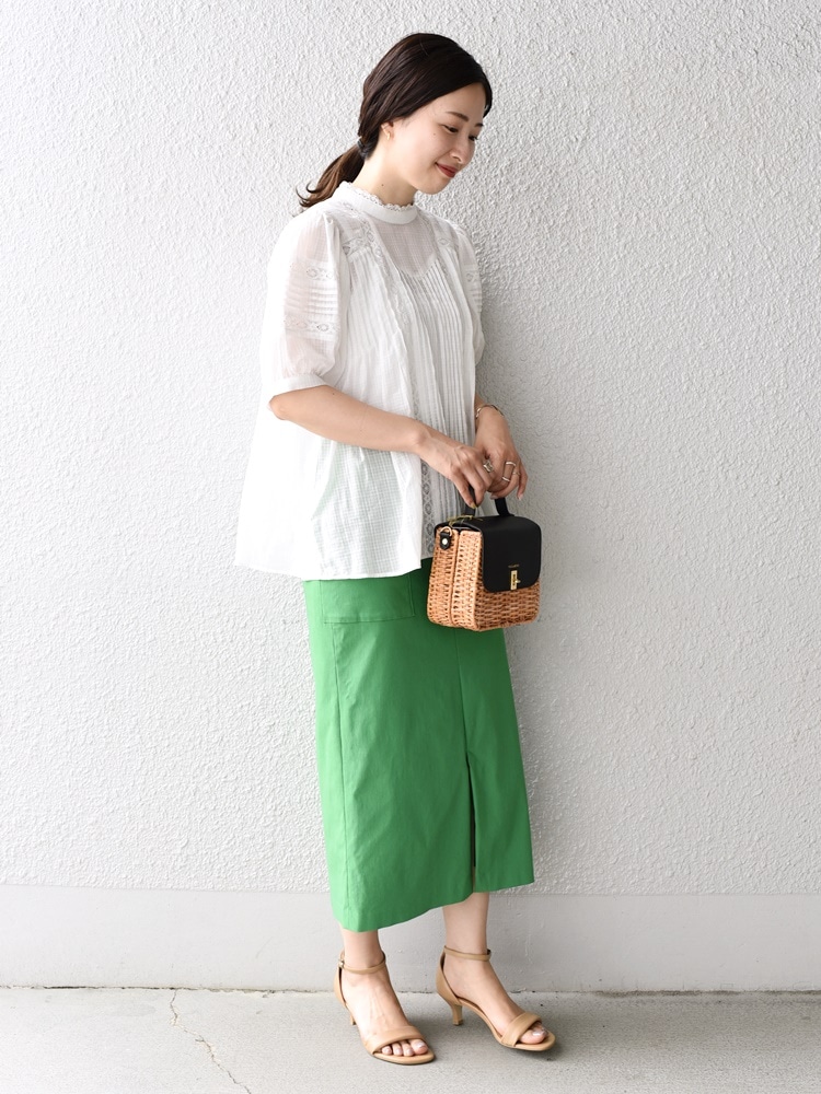グリーンをアクセントにした、大人かわいいコーディネートに。