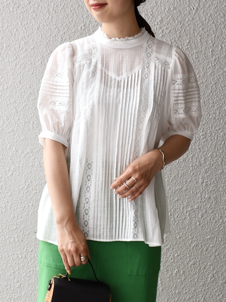 女性らしさを演出してくれるレースデザイン半袖ブラウス