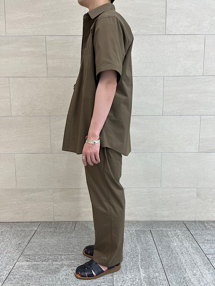 【素材感・着心地】ポリエステルとコットンを使用したセットアップ。サラッとした肌触りが特徴。シャツはややスマートめなデザインで、パンツはややゆったりとしたシルエット。