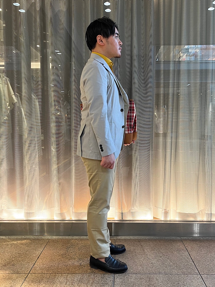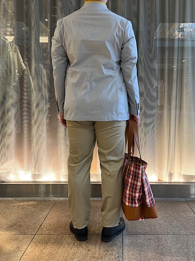 季節感を出したジャケットスタイルです。シアサッカー生地が涼しげで洒落感が増します。