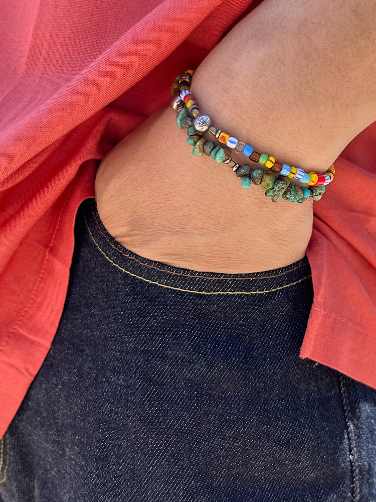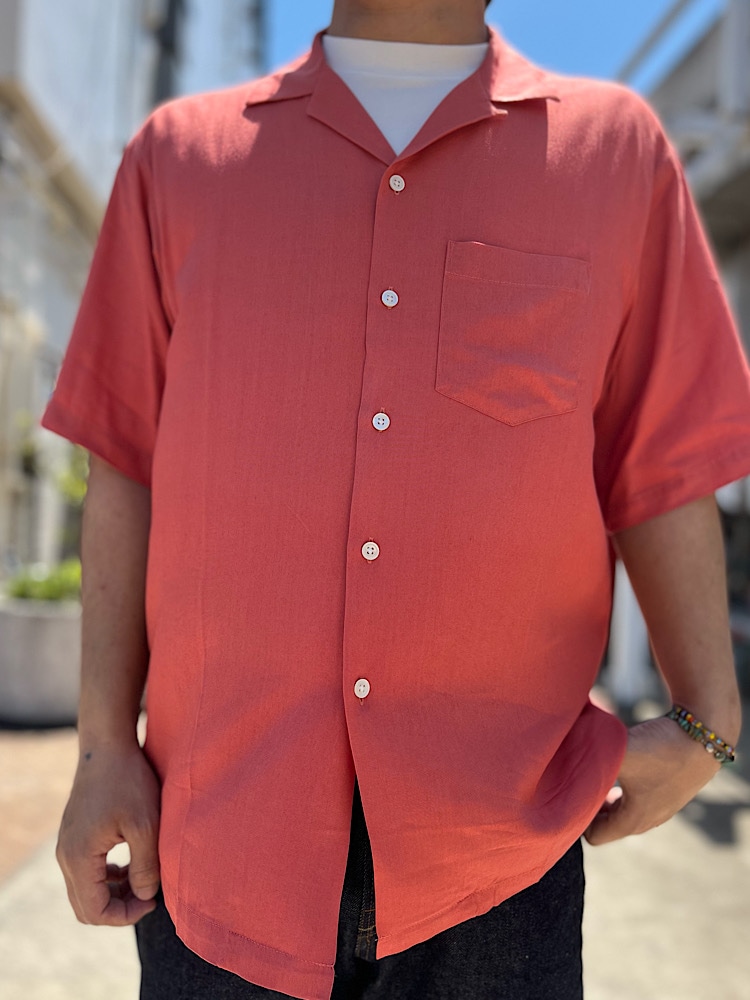 今回はレーヨンのオープンカラーシャツにデニムを合わせたコーディネートです。半袖にアクセサリーをつけることで、アクセントになります。