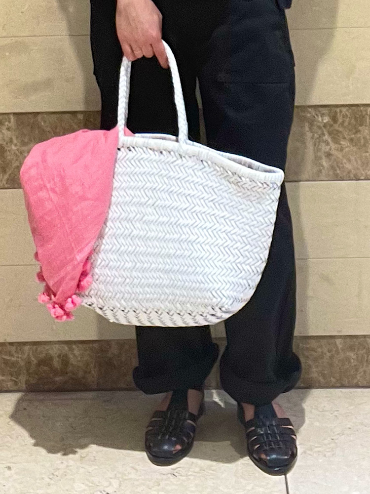 モノトーンを基調としたスタイリング。小物で軽さを出して抜け感を演出。アクセントカラーはその日の気分でチェンジ。