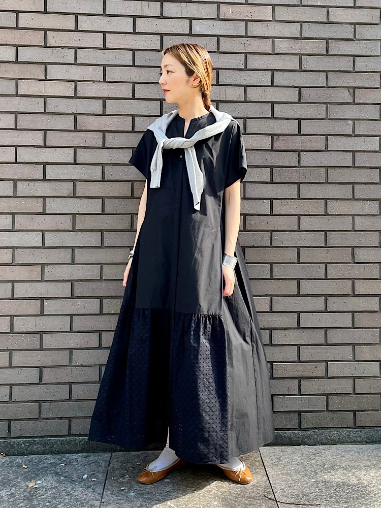 素材感・着心地:コットンの少しハリのある素材感。裾部分がカットレースになっており少し透け感がありますが、ペチコートが付いています。袖もあり、一枚で決まるワンピースです