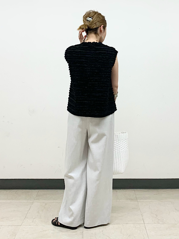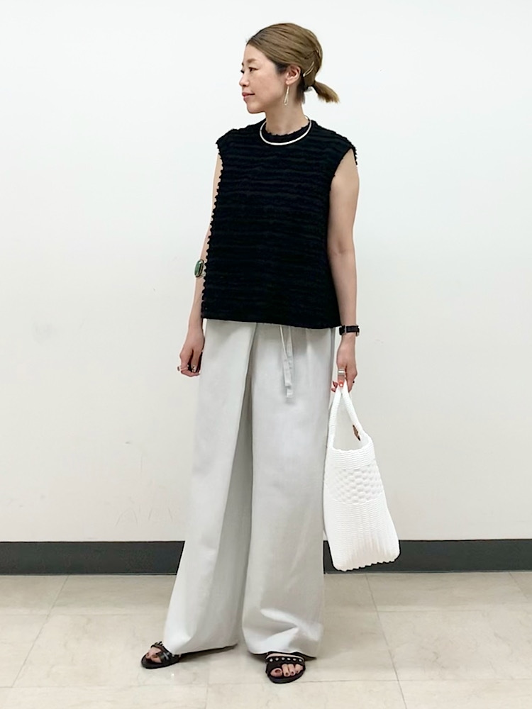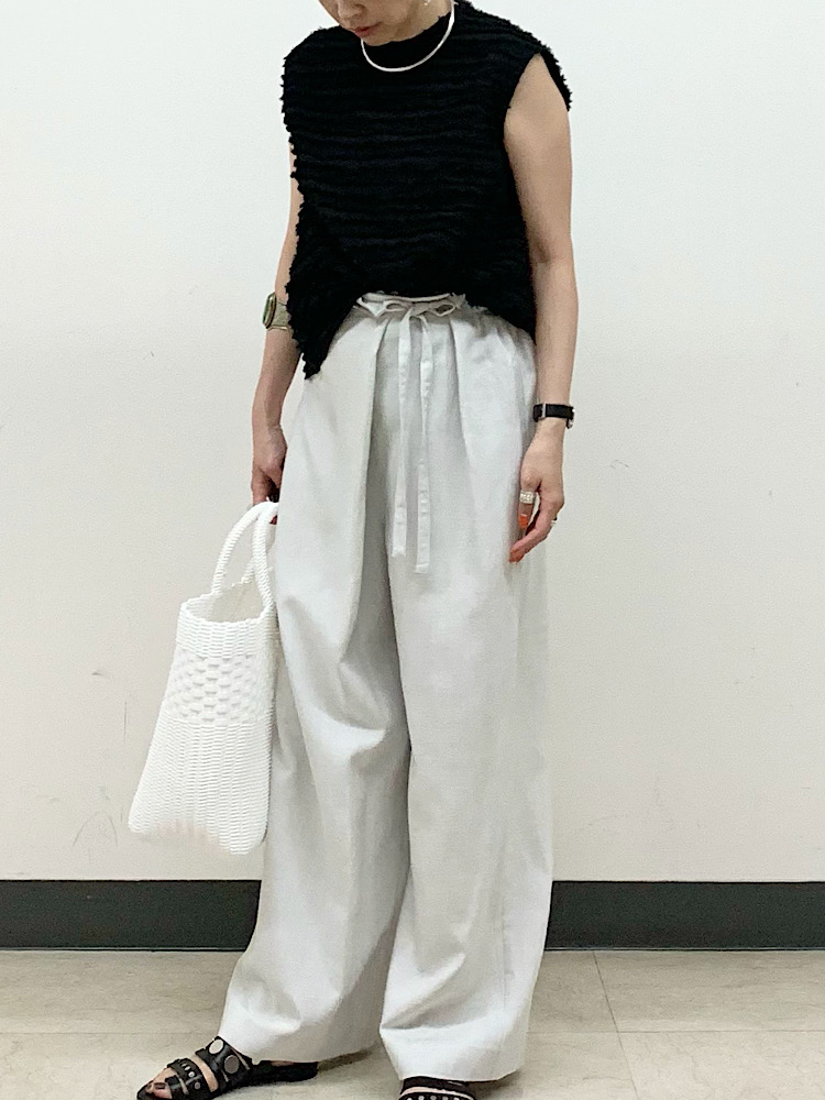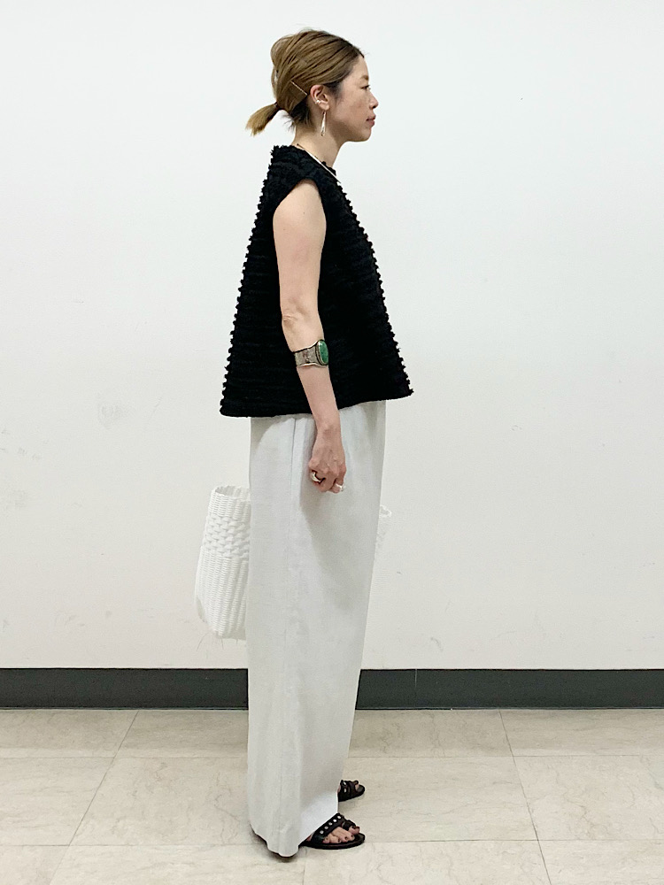 一見シンプルな形ですが、凹凸感のある素材のトップスと、控えめなデザインのラップパンツで、存在感のある着こなしになりました。