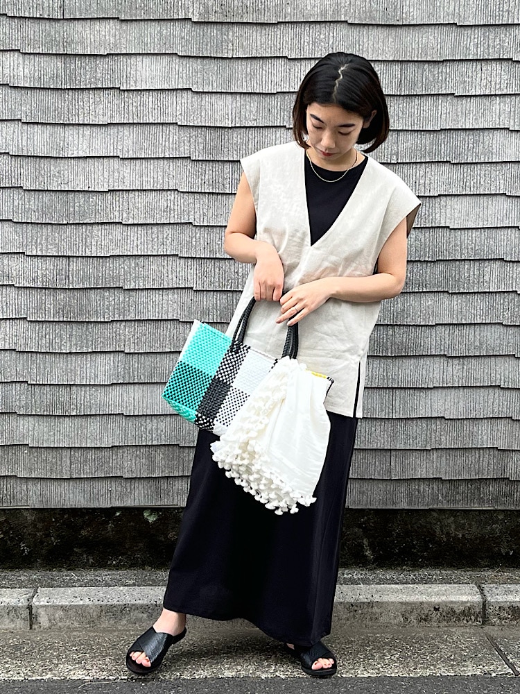 シンプルなワンピースにベストを重ねたレイヤードコーディネート。