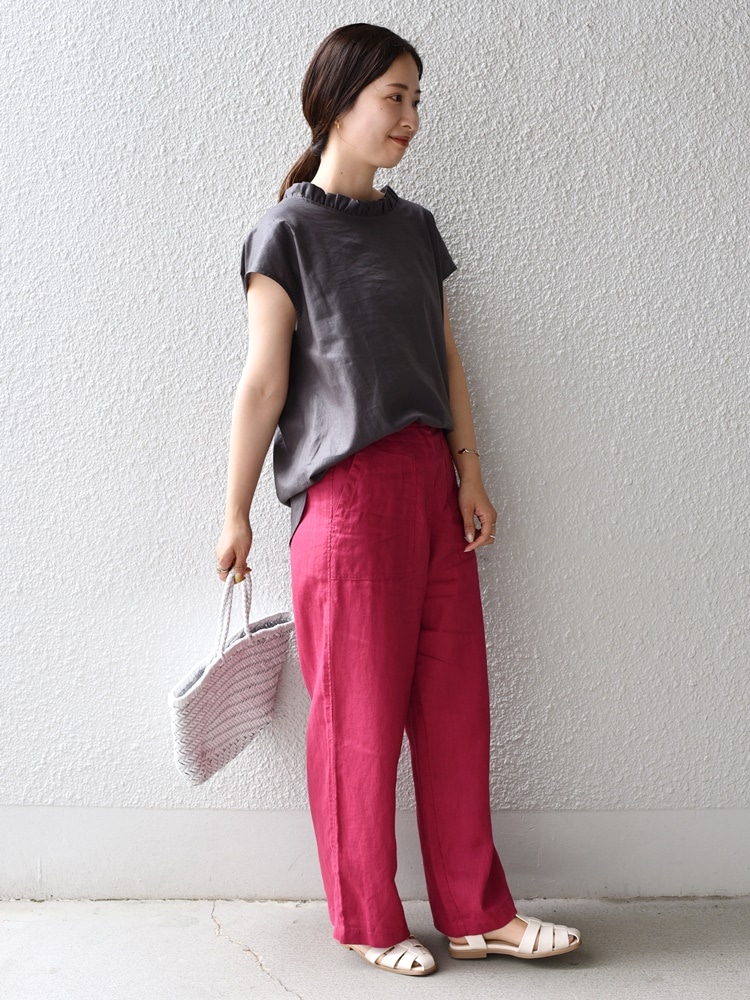 着心地:リネン素材ですが肌当たりが良く、ストレスフリーな穿き心地。ドロストの紐は内側にあるので、トップスをインしてもきれいに見えます。