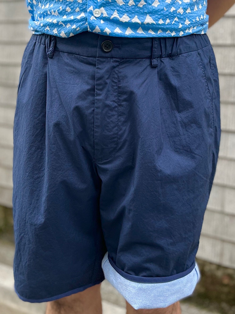 素材感/着心地:ダブルフェイス仕様で裾をまくって穿いて頂くと、また違う印象になるのが特徴です。表裏の生地は互いに薄いので、とても軽いです。内側にドローコードがついていますのでベルト無しでお使い頂けます。