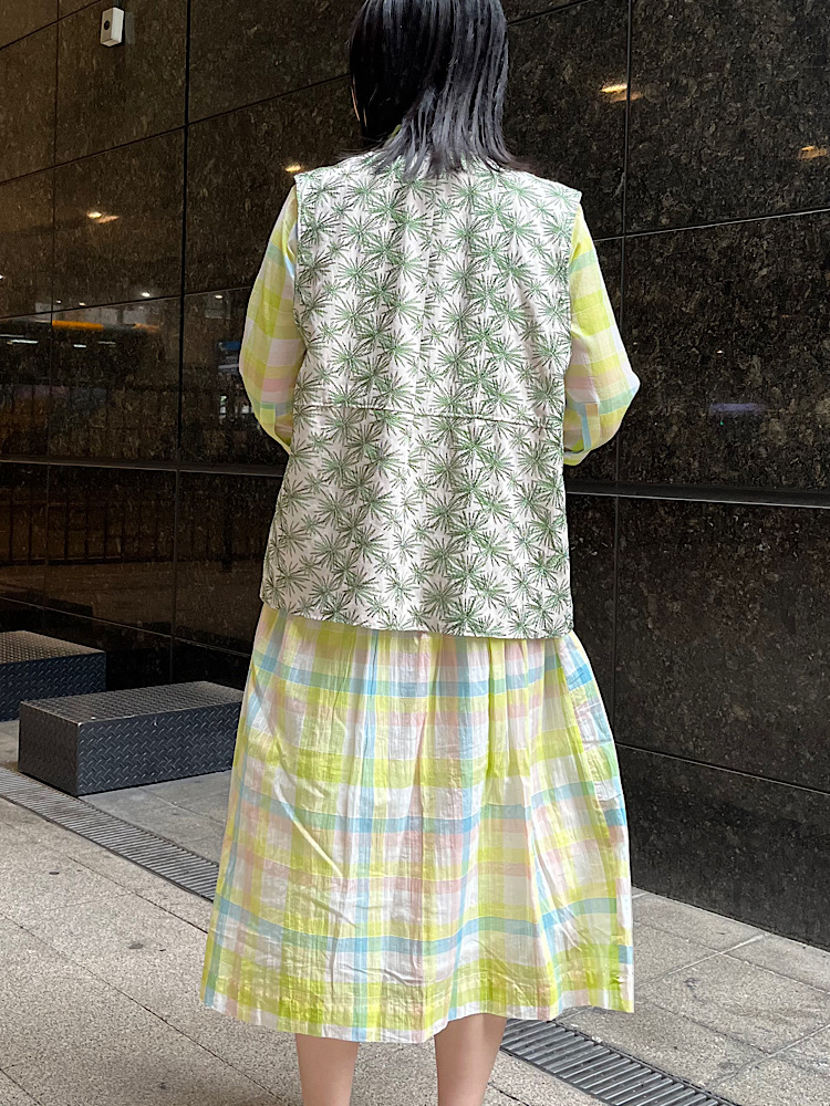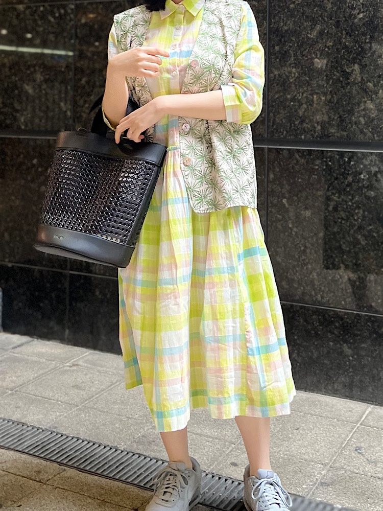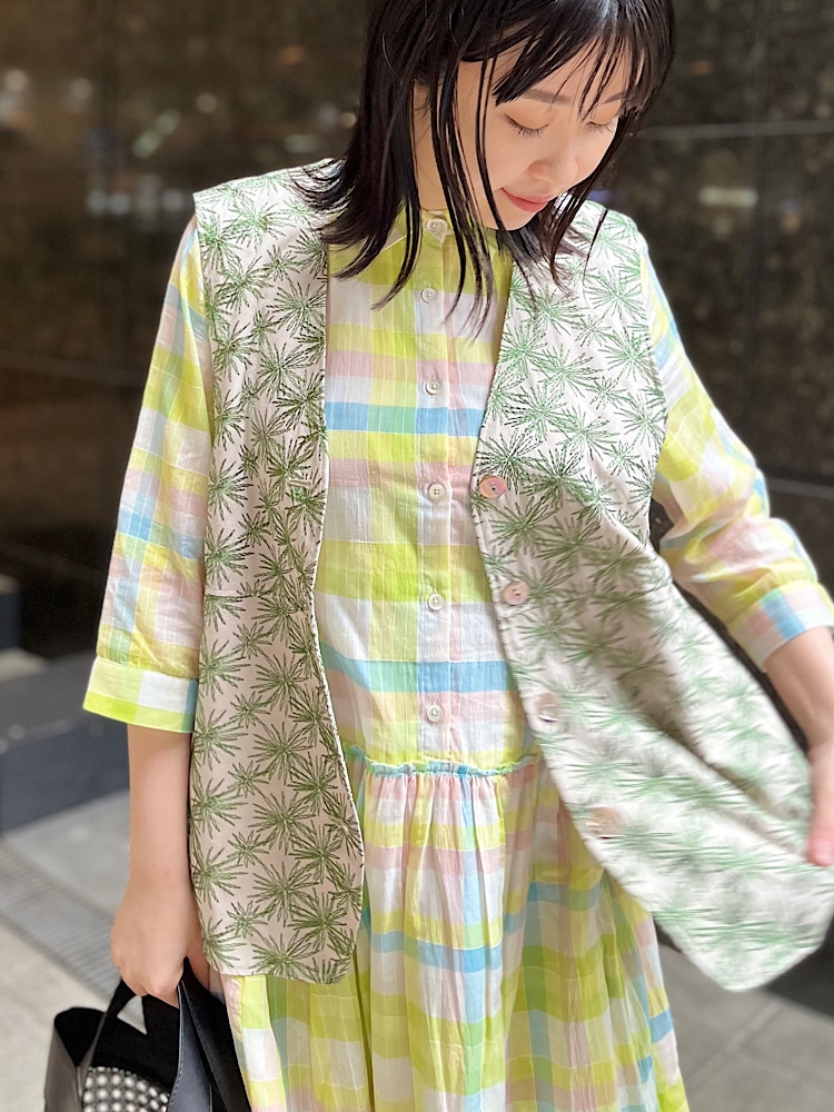 カラーが絶妙で非常にかわいいmiiのワンピースです。淡いトーンなのであえて総柄ベストを合わせて元気なコーディネートに!