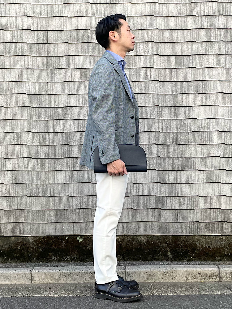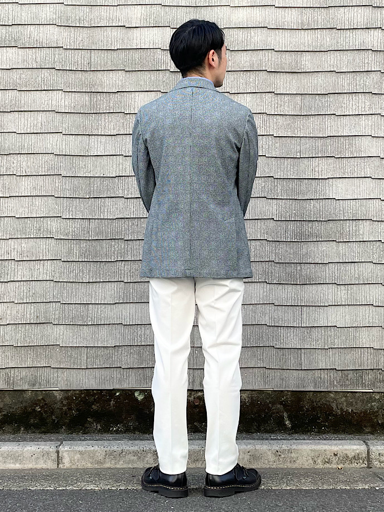 柄モノを使ったジャケパンスタイル。