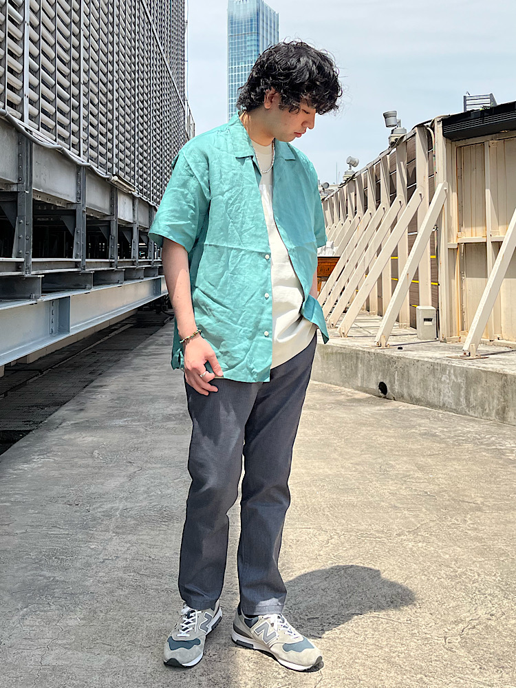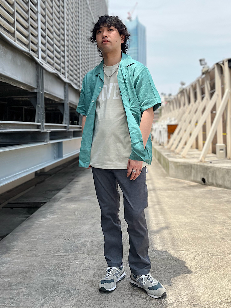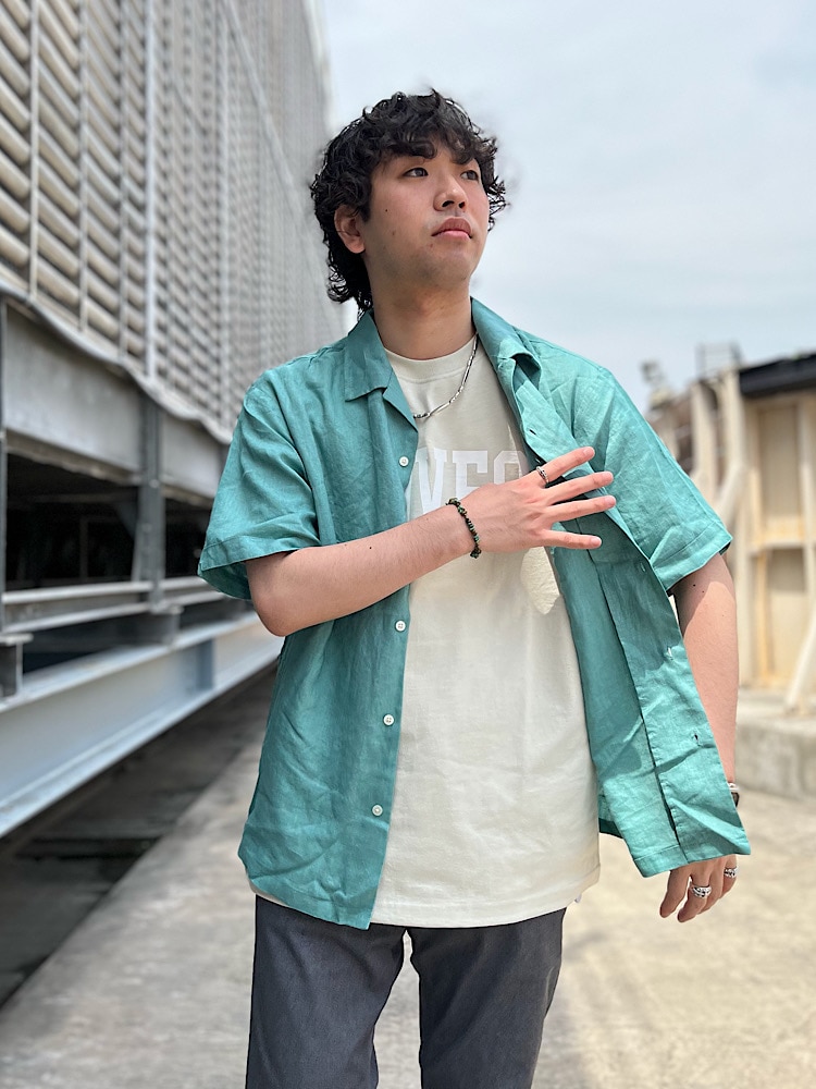 今回は昨年好評だったカレッジプリントTシャツに爽やかなオープンカラーシャツを羽織りました。パンツはスリムテーパードのチノパンを履いて大人カジュアルな印象に!