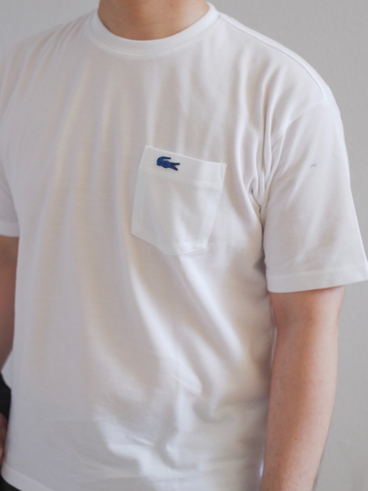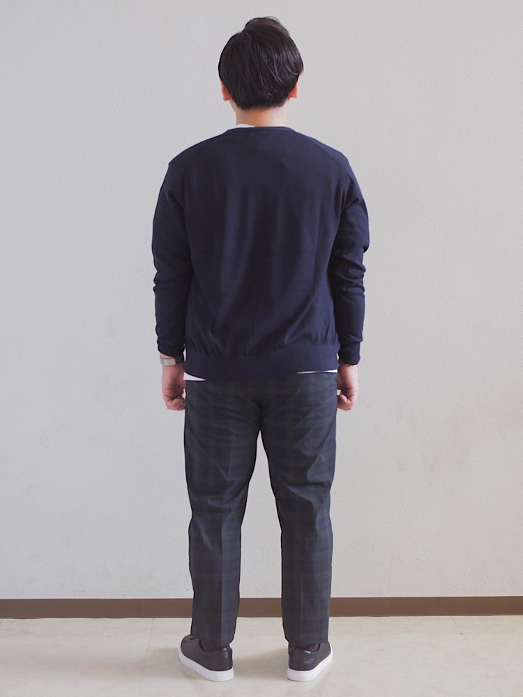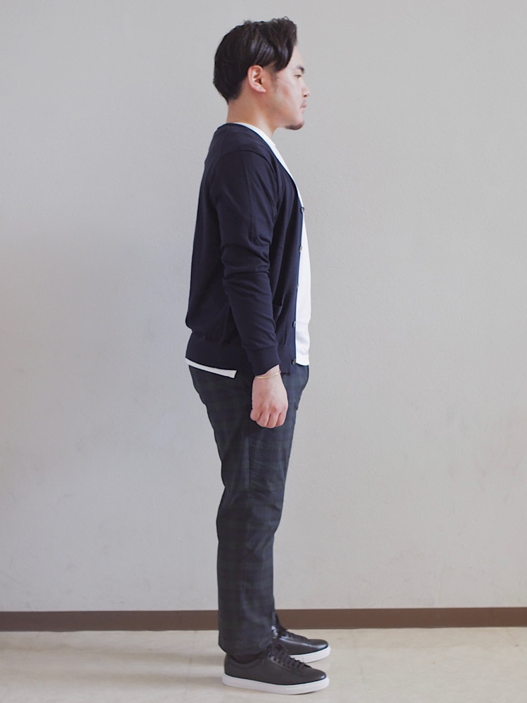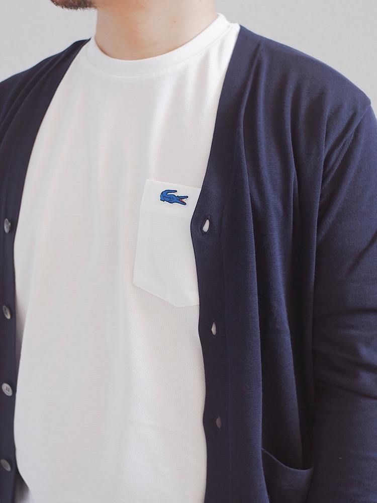ラコステのクルーネックのカットソーを主役にした大人のカジュアルコーディネートです。ラコステに合う、ブラックウォッチ柄のパンツとネイビーのカーディガンを合わせて、クラシカルなプレッピーっぽさを出した上品なスタイルに仕上げています。
