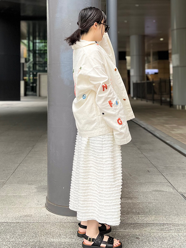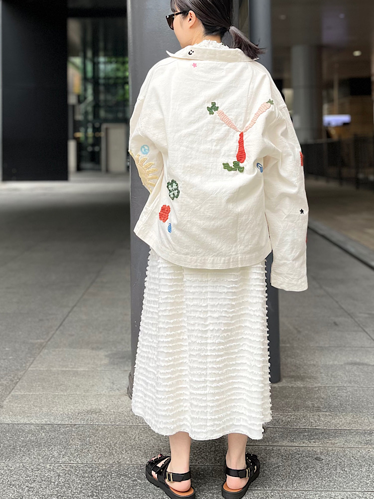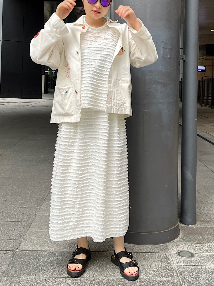 着心地:やわらかく、見た目よりも薄手の生地が夏場にも着やすいです。少し透け感はあるので、インナーはベージュなどお肌に近いカラーがおすすめです。立体感があるデザインで、一枚でもフェミニンかつモードに決まります。デニムと合わせてもかわいい!