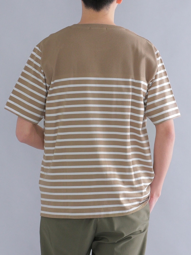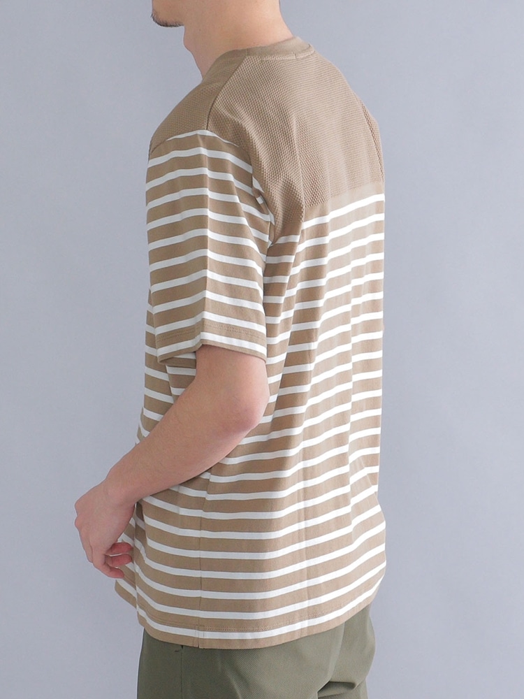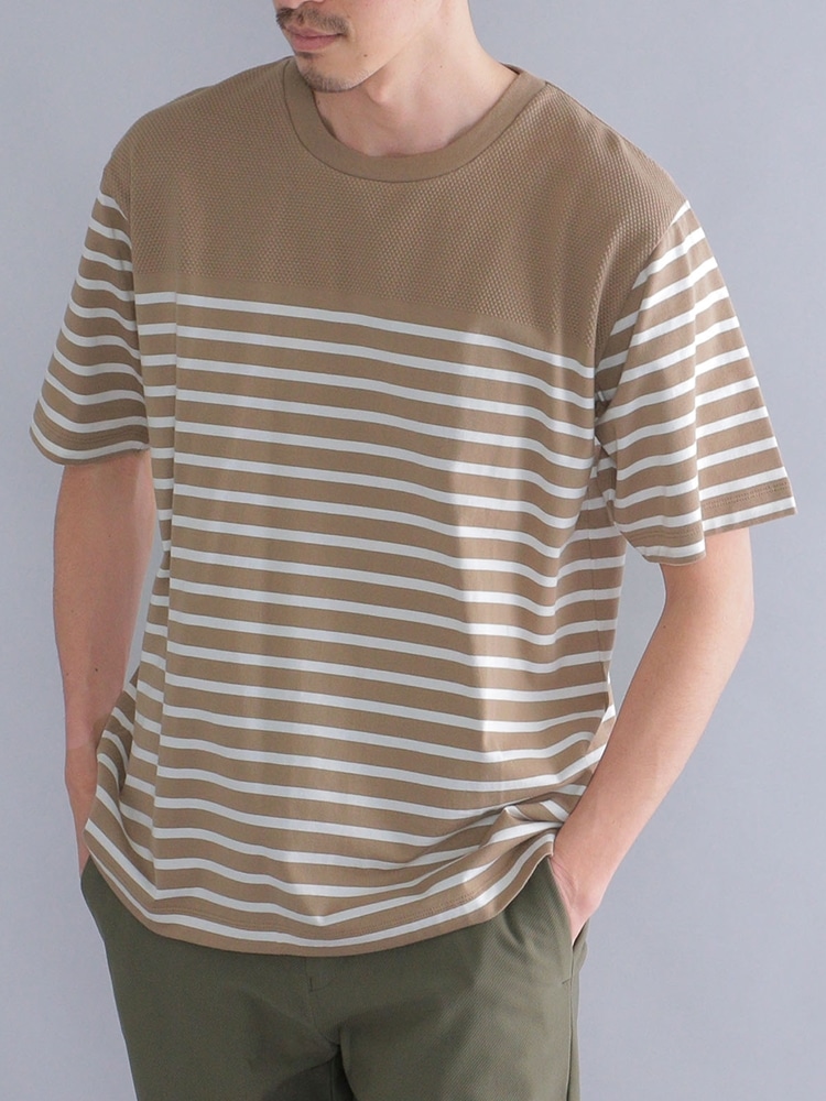 アースカラーでまとめたボーダーTシャツのスタイリング。