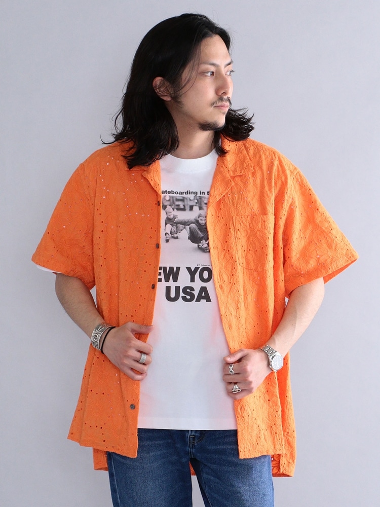 雰囲気のあるフラワーレースの生地を使用したオープンカラーシャツ