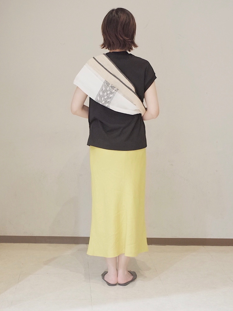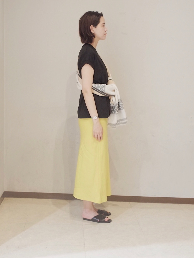 二の腕が少し隠れる袖丈で着やすく、すっきりとしたラインです。