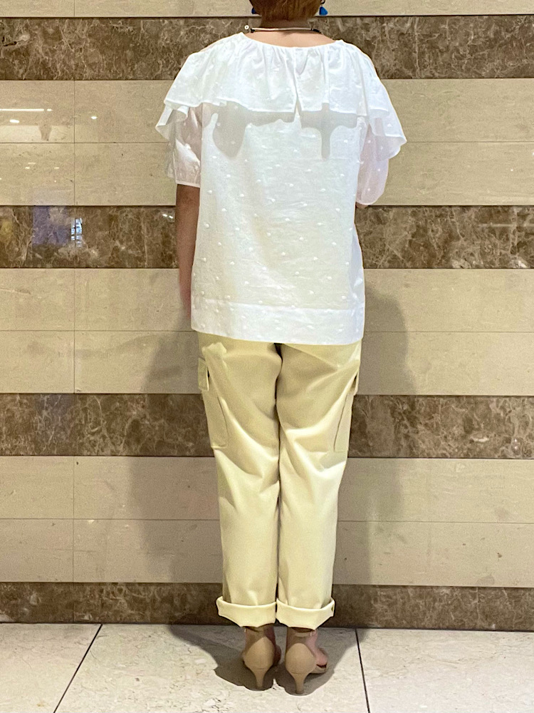きれい色と足もとのヒールで、カーゴパンツを女性らしくシフト。裾のロールアップがポイントです。脚がすっきり見えるよう計算されたパターンのカーゴパンツは、ふんわりフリルブラウスと好相性。