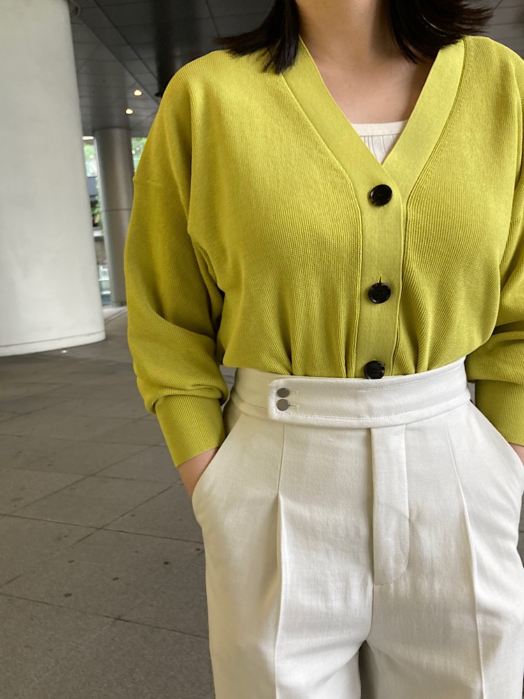着心地:細かいメッシュの素材がコーディネートに軽さをプラスしてくれます。袖のリブ部分が長めでぴたっとしていて手首を華奢にきれいに見せてくれます。首元のVネックデザインはあきすぎずも顔周りはすっきりした印象に。意外と無いぱきっとしたカラーリングが目を引きます!