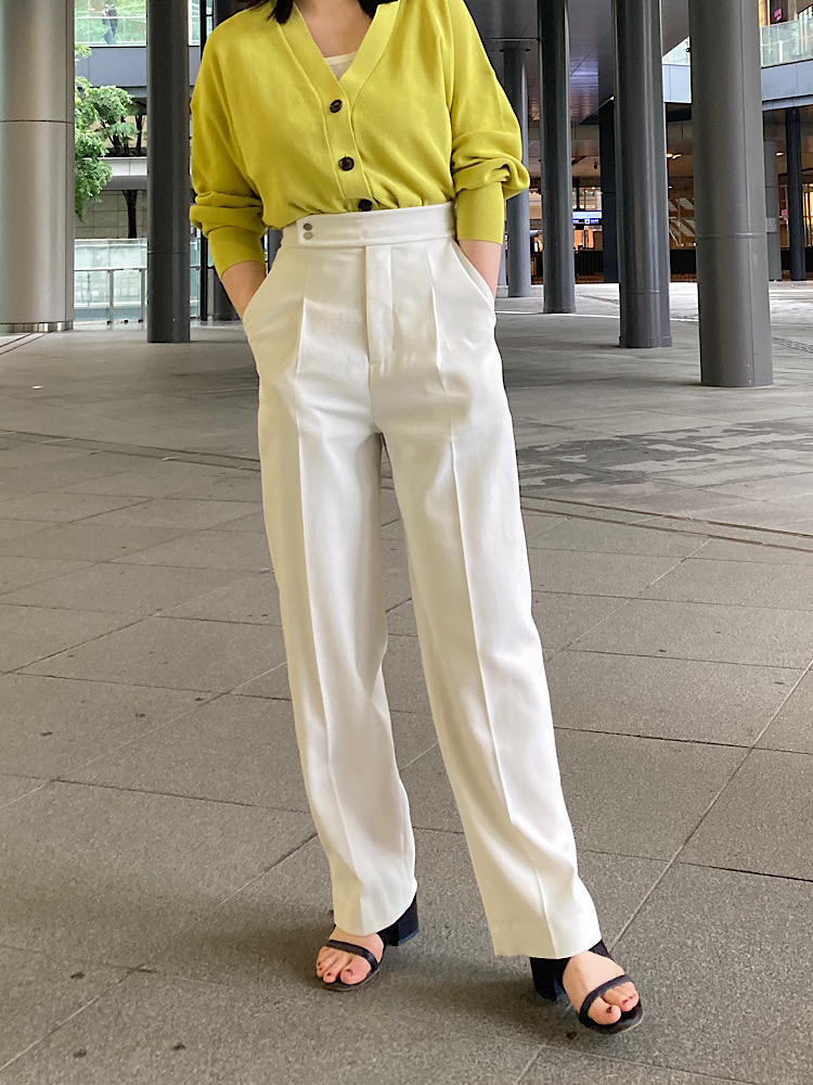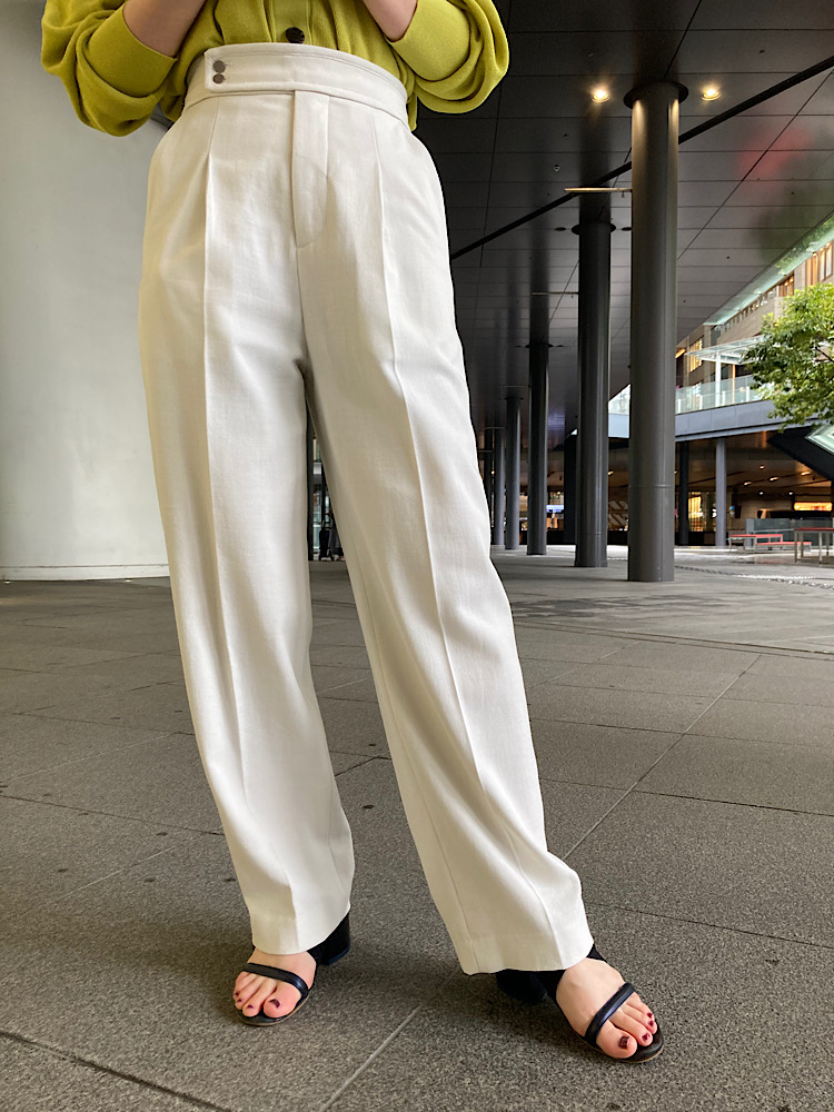 着心地:重なったベルト風のデザインとメンズライクなトラウザーシルエットがかっこいいです。長さはこのサイズで真っすぐすとんと落ちてますが、ウエストはトップスをINすると少しぴったりめに感じました。しっかり厚みのある生地が白でも透け感を心配せず着用頂けます。厚みはありますが、さらっとした素材感で足にまとわりつく感じがなく履きやすいです。