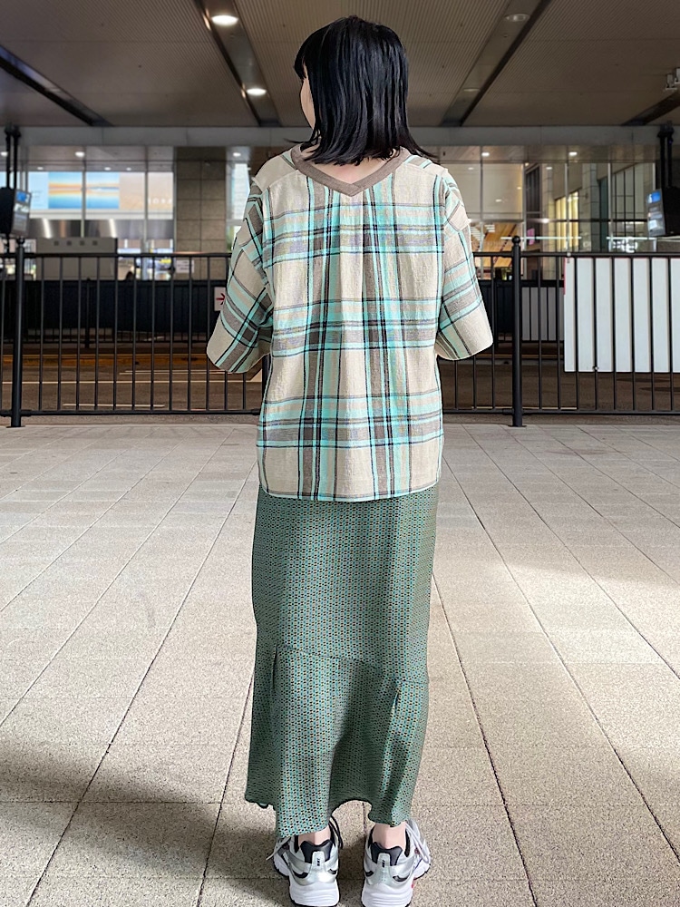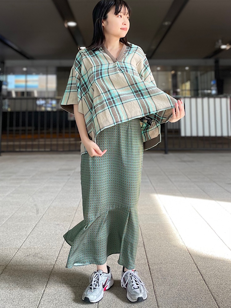 グリーンのチェックが爽やかなトップスに細かな柄が上品なスカートを合わせてワントーンの柄コーデに。