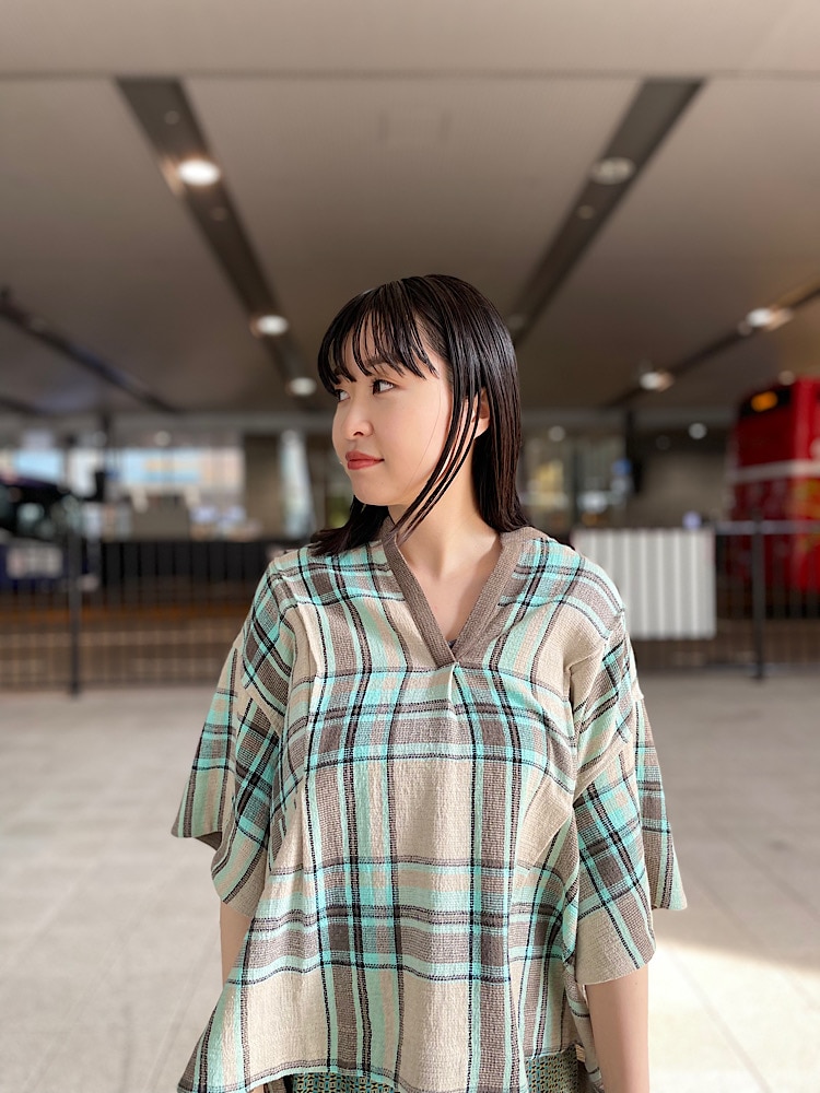 着心地:ニットのような厚めのカットソーのような不思議な素材感でだぼっとさらっと着用頂けます。大きめなスキッパーデザインで顔回りもすっきりと見せてくれ、レイヤードもしやすそうです。全体的にゆったりとしているので、ボトムスは細身のパンツやタイトスカートなどコーディネートにめりはりを出してくれるスリムなシルエットがおすすめです。