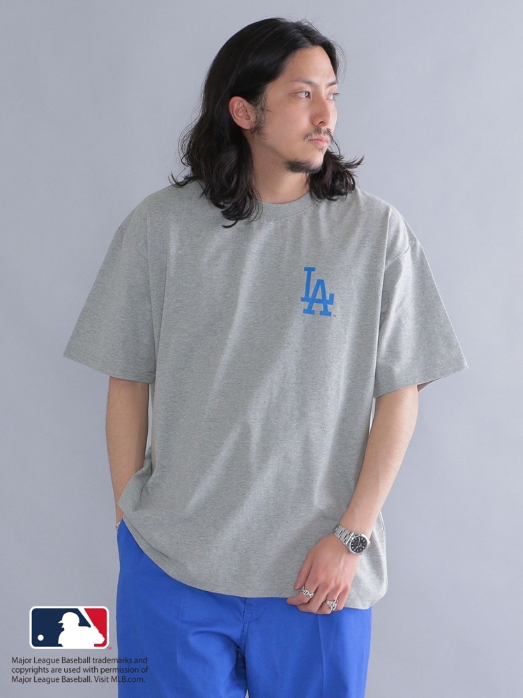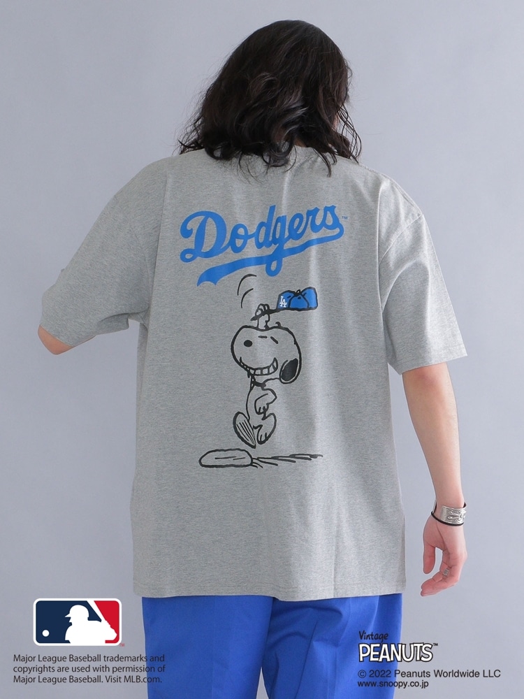 MLB×スヌーピーのスペシャルなTシャツを使用したグレー×ブルーコーデ
