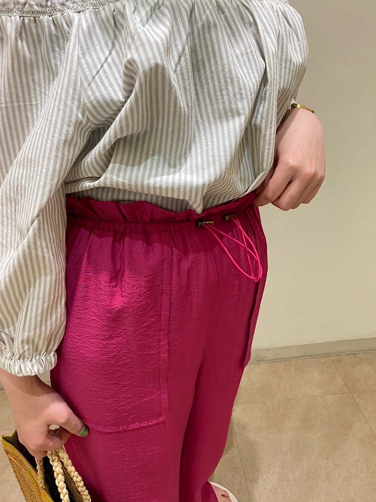 着心地:首元のギャザーとストライプがポイントのブラウス。ボトムスを選ばずにスタイリングを楽しんで頂けます。