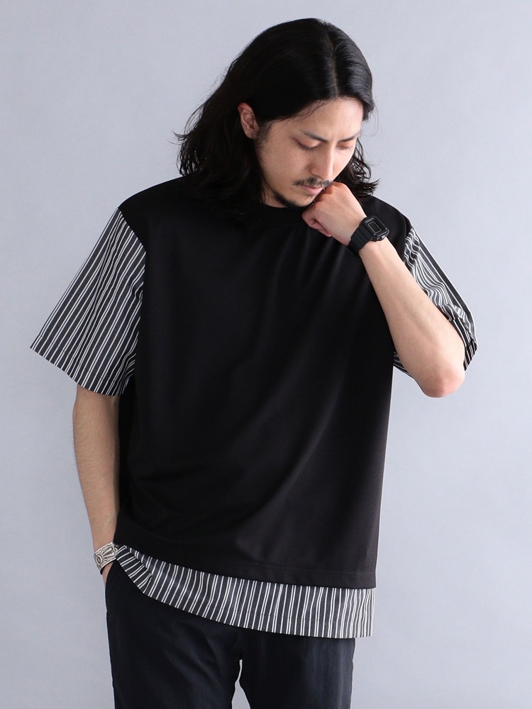 素材感:伸縮性、保形性に優れたクリーンな表情が魅力のポンチ素材とシャツ生地の切り替え。