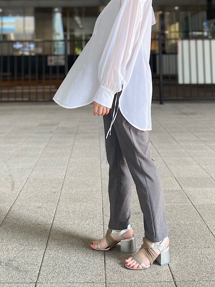 ベーシックなパンツスタイリングですが、胸元に切り替えのある素材を取り入れてシンプルになりすぎず上品に見えるように意識してみました。