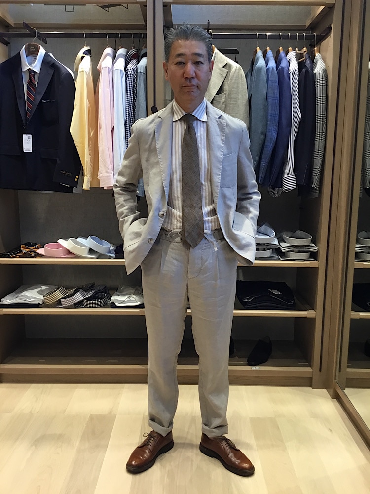 今回はタイドアップでコーディネートしてますが、Tシャツとか,リネンのシャツと合わせて,レザーサンダルなんかでコーディネートしても雰囲気あります。