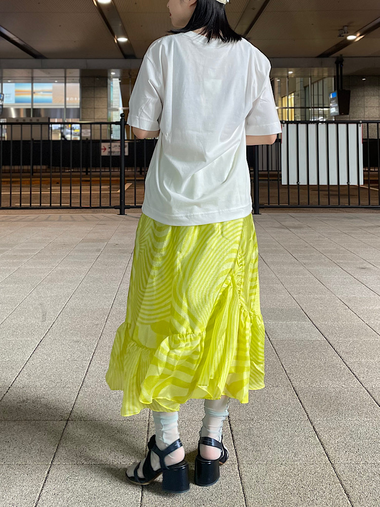 着心地:シンプルなTシャツやブラウスに合わせるだけで一気に華やかになるスカートです。ウエストのゴムバンドは広めになっているので、腰回りの負担も少なく、らくらく着用頂けます。足首までの丈で、小柄な方から身長が高い方まで幅広いスタイルの方に取り入れて頂けそうです。