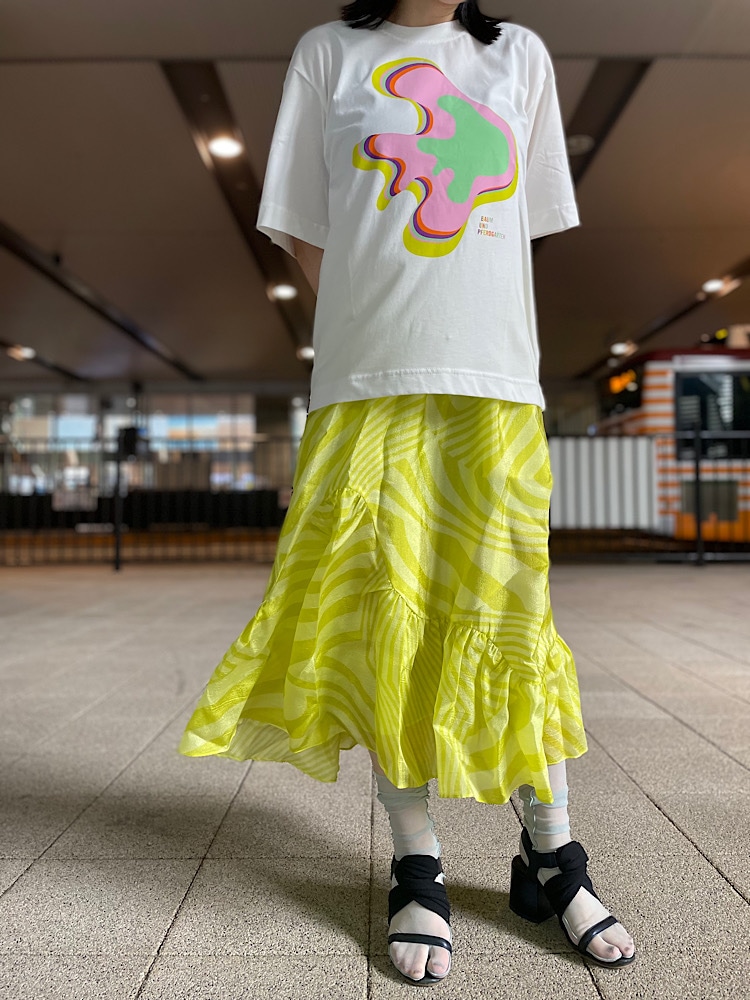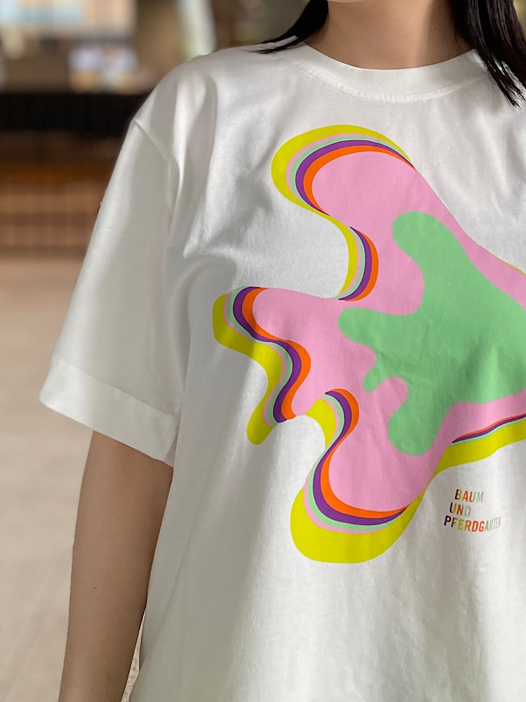 着心地:やわらかいカットソー生地で、体のラインを拾い過ぎない程よくゆとりがあるシルエットです。生地が薄すぎず、白でも透け感は気になりません。コンパクトめな丈感で、INスタイルももちろん、リラックスパンツを上からカジュアルに着て頂いてもかわいいです!前面の大きなカラープリントが目を引きます。