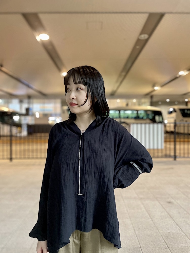 着心地:表面感のある素材が季節感抜群のアイテムです。さらっとしていて速乾性があつので、長袖でも快適に着ていただけます。首元が少し空いたデザインが顔まわりもすっきり、首筋もきれいに見せてくれます。